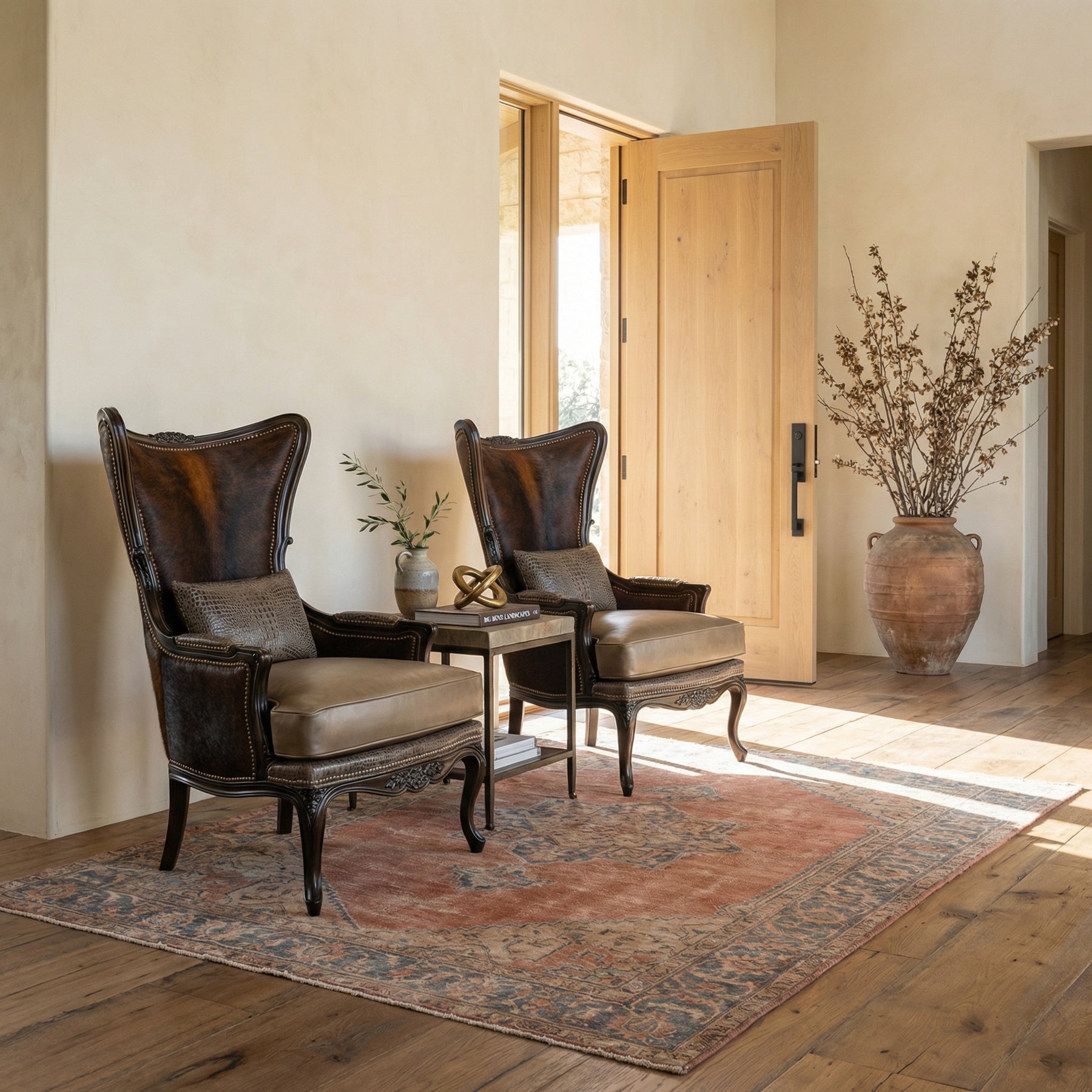 Make a bold, elegant statement with the Brindle Chocolate Chair — a masterfully crafted piece that blends Western luxury with regal sophistication. Featuring a dramatic high-back silhouette wrapped in genuine brindle cowhide, this chair showcases carved wood detailing, a hand-finished espresso frame, and a rich chocolate leather seat. The embossed croc leather trim and matching accent pillow add texture and depth, making this chair a standout piece in any lodge, study, or refined living room.