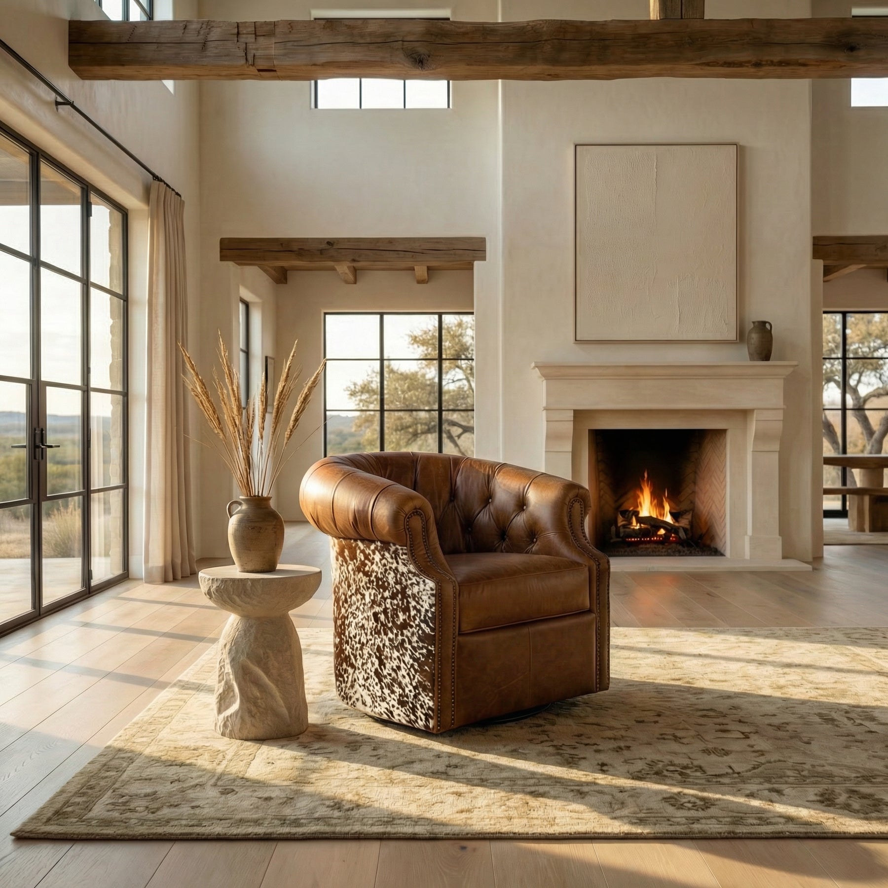 Elevate your living space with the bold Western elegance of our Coyote Hair-On-Hide Longhorn Swivel Chair. Wrapped in rich full-grain leather and accented with genuine hair-on-hide panels, this chair delivers a perfect balance of rugged character and refined comfort. The tufted barrel-back design offers a supportive, enveloping sit, while the smooth swivel base adds modern functionality for everyday living.