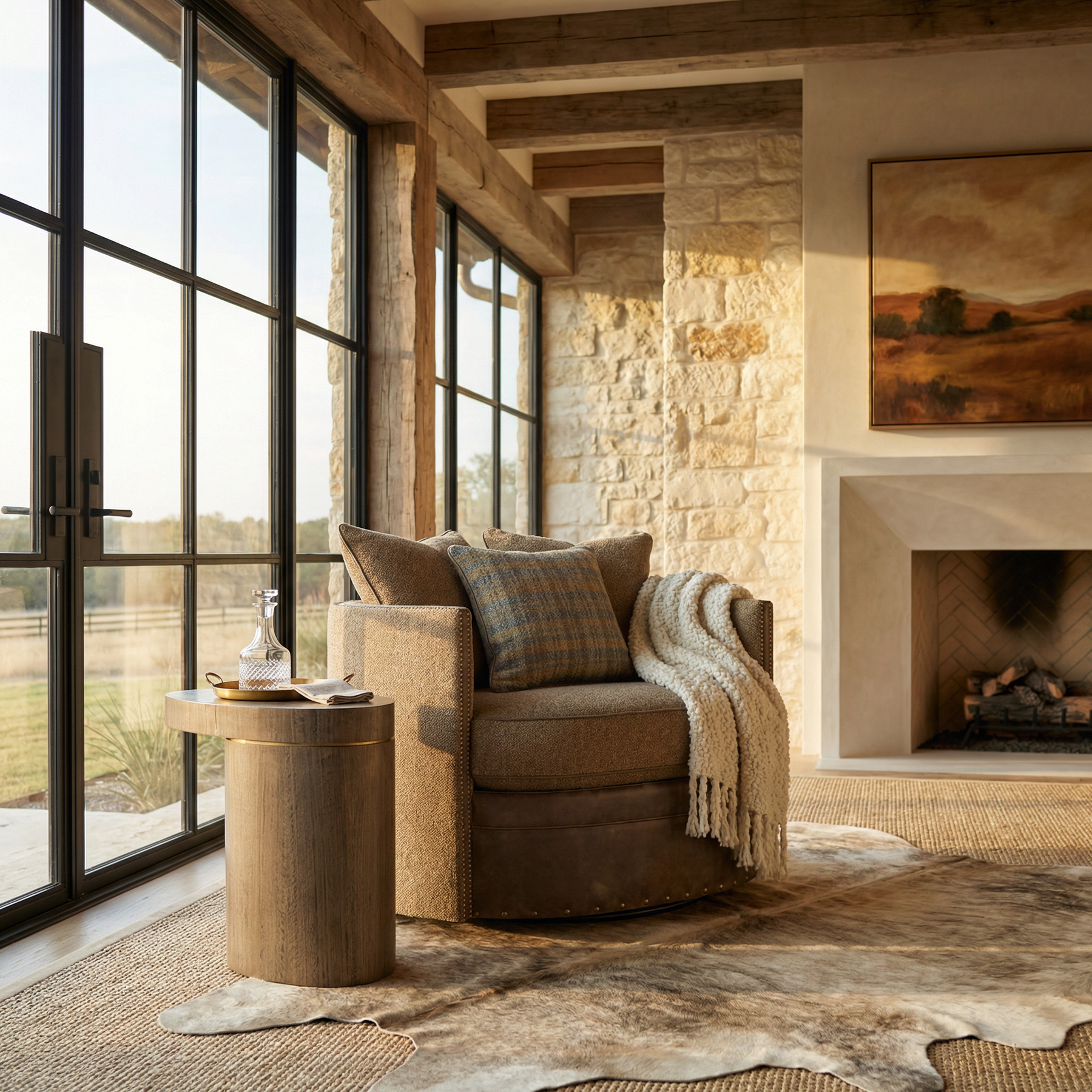 Relax in effortless style with the Durango Swivel Chair, where comfort meets Western sophistication. Designed with plush cushioning and a smooth 360- degree swivel base, this chair offers the perfect blend of luxury and function. The rich taupe upholstery is paired with a soft leather base, accented by antique brass nailhead trim for a refined, handcrafted finish.