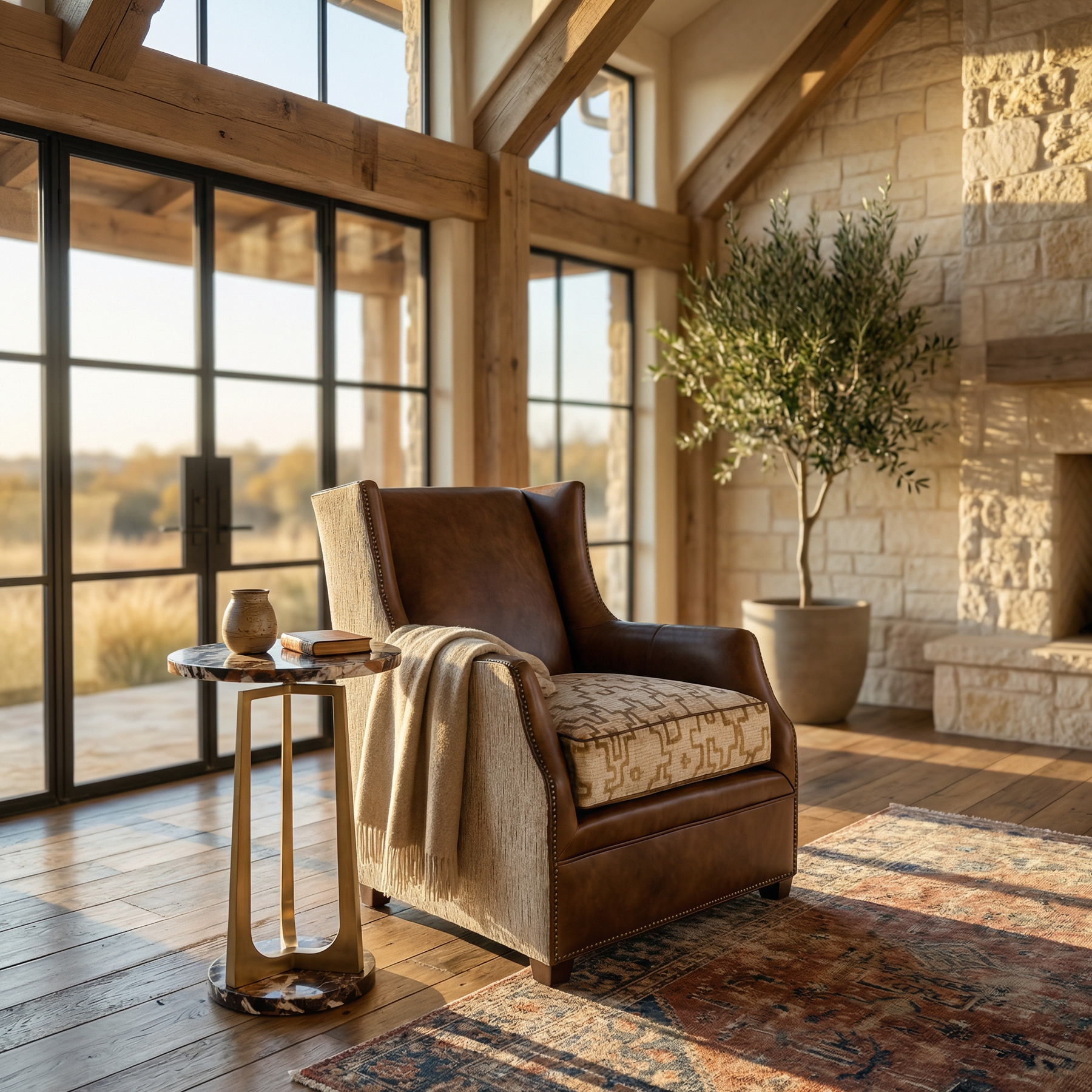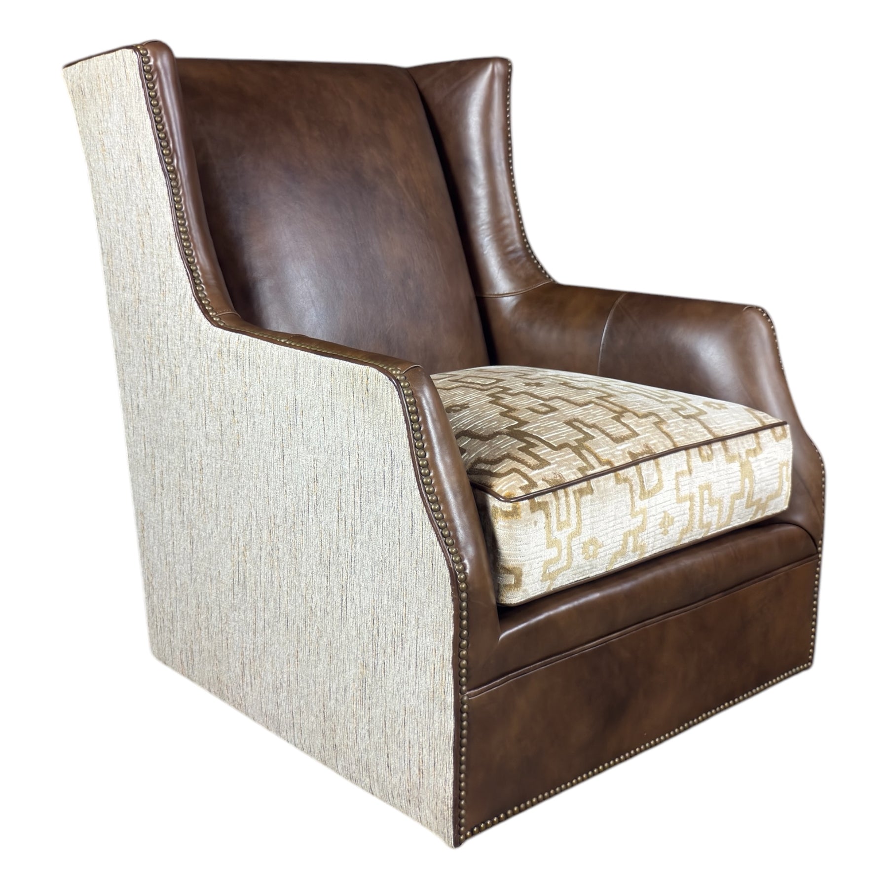Elevate your interior with this sophisticated Greyson Nashville Chair, where clean lines meet refined Western style. Wrapped in rich brown leather across the seat and inner back, this chair features a beautifully textured fabric exterior and a geometric-patterned seat cushion for added depth and interest. Nailhead trim outlines the silhouette, adding classic detail, while the smooth swivel base provides easy mobility — perfect for conversation areas, studies, or upscale lounges.