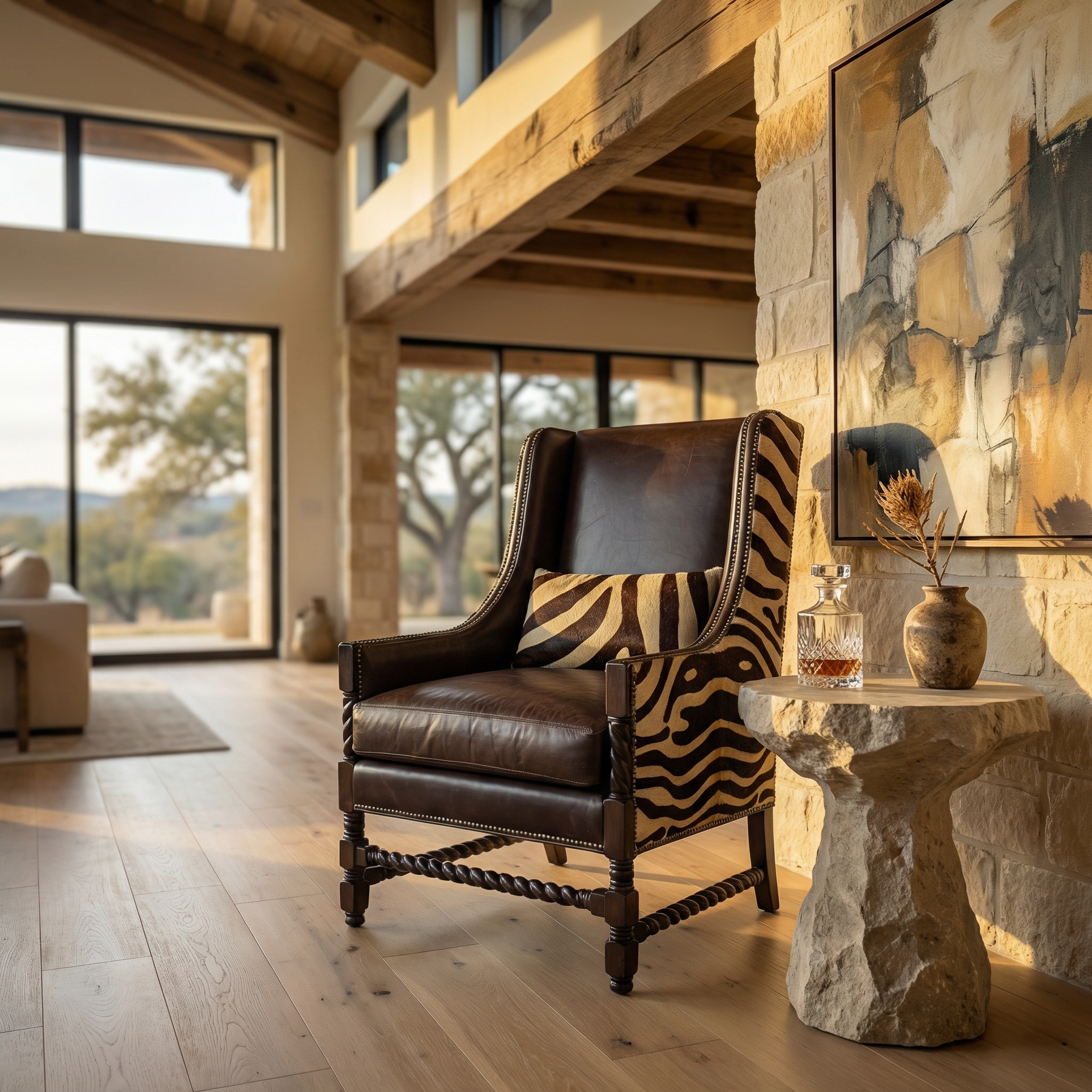 Bring home timeless sophistication with a wild twist in the Neil Highball Chocolate Wing Chair. Upholstered in deep chocolate top-grain leather, this stately high-back chair features a classic silhouette with hand-carved twisted wood legs and stretchers for added character. Eye-catching zebra-patterned hair-on-hide accents line the sides for a bold, exotic edge, while the nailhead trim adds a polished finish. The supportive cushioning and generous seat depth offer the comfort of a lounge chair with the elegance of a collector’s piece.