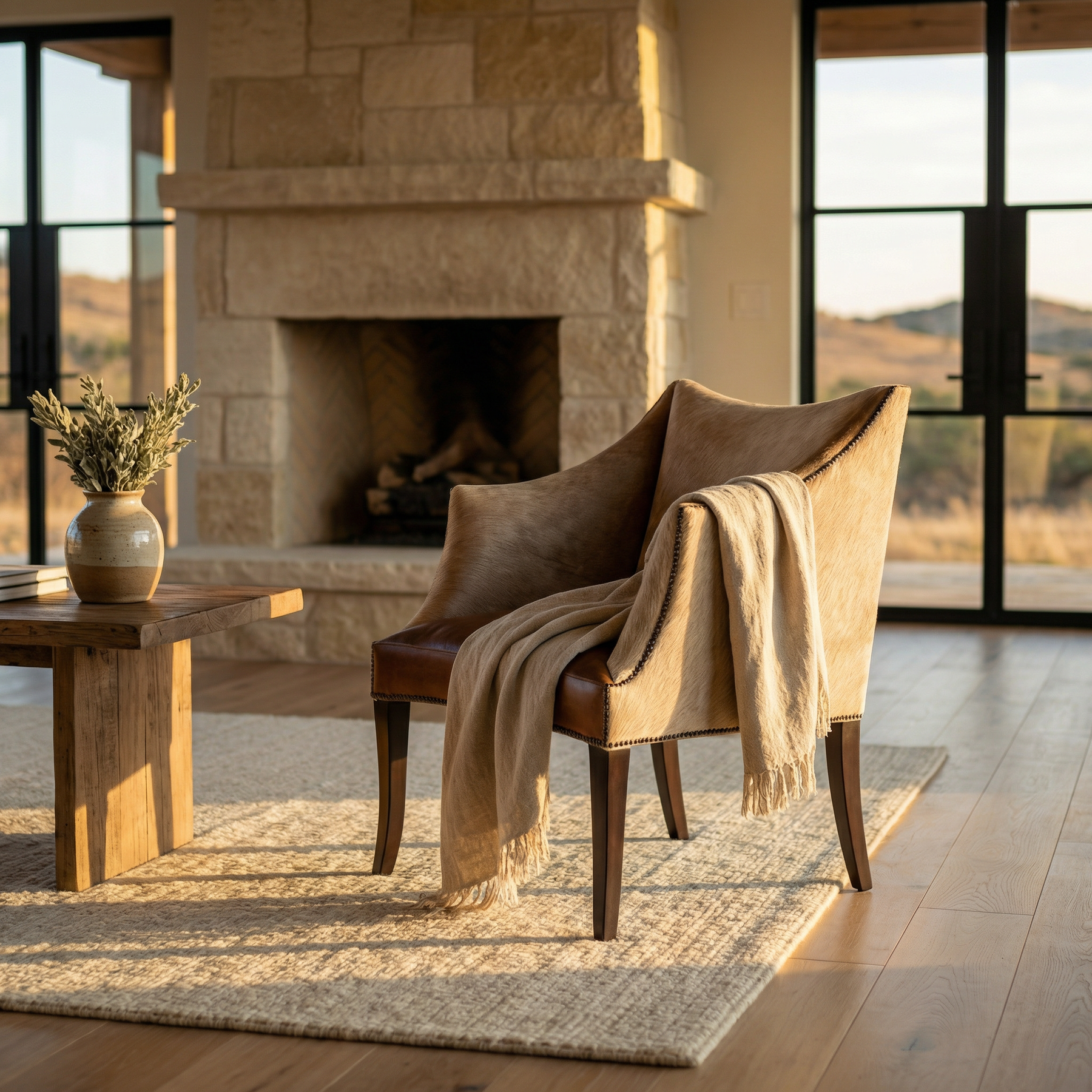 Refined yet rustic, the Marcus Chair blends sleek design with natural textures for a sophisticated Western aesthetic. Upholstered in a combination of smooth brown leather and genuine hair-on-hide, this chair brings warmth and contrast to any space. The gently sloped arms and tapered wood legs create a modern silhouette, while the nailhead trim adds a timeless touch. Whether used in a dining room, office, or accent space, the Marcus Chair delivers bold character and lasting comfort.