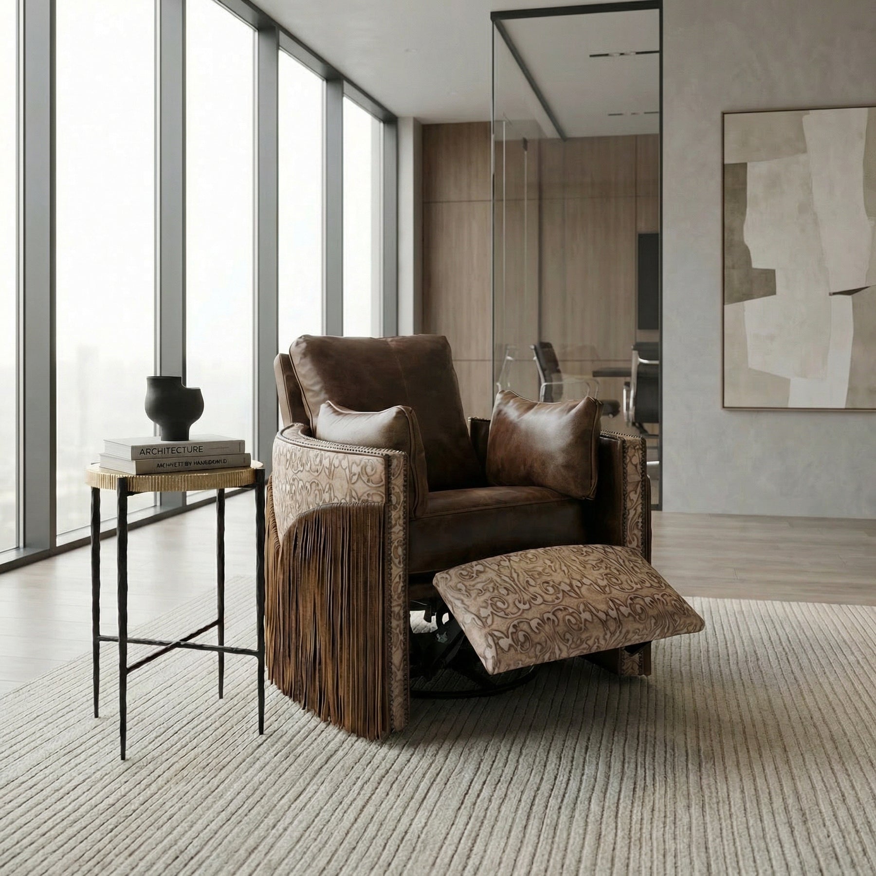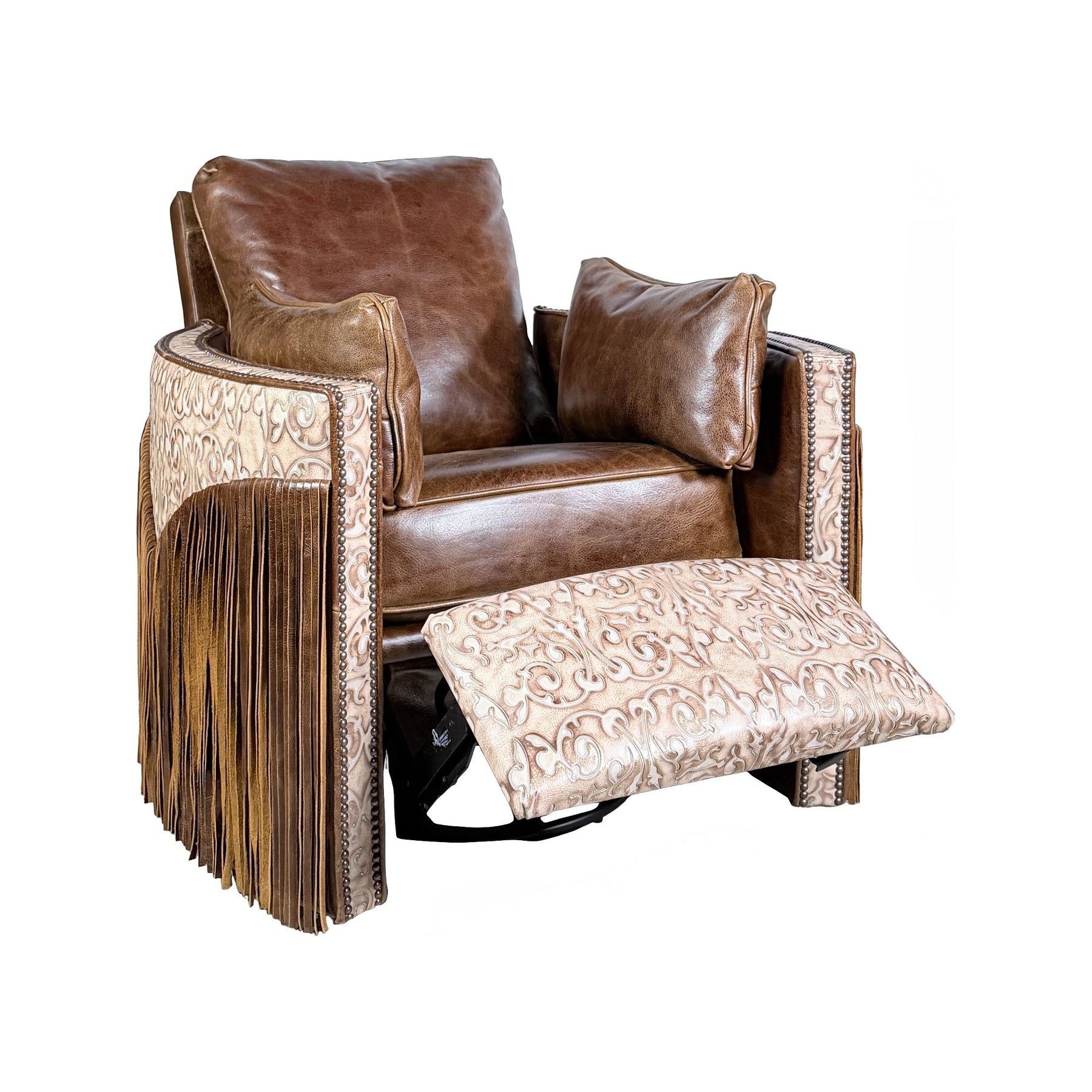 The Cimarron Swivel Chair embodies rugged Western heritage with elevated craftsmanship and unmatched comfort. Wrapped in rich, hand-burnished leather, this statement piece showcases warm tones and natural character that only improve with time. Intricate embossed detailing along the arms adds refined artistry, while nailhead trim outlines the silhouette with tailored precision. Dramatic leather fringe cascading from the sides introduces bold movement and authentic ranch-inspired flair.