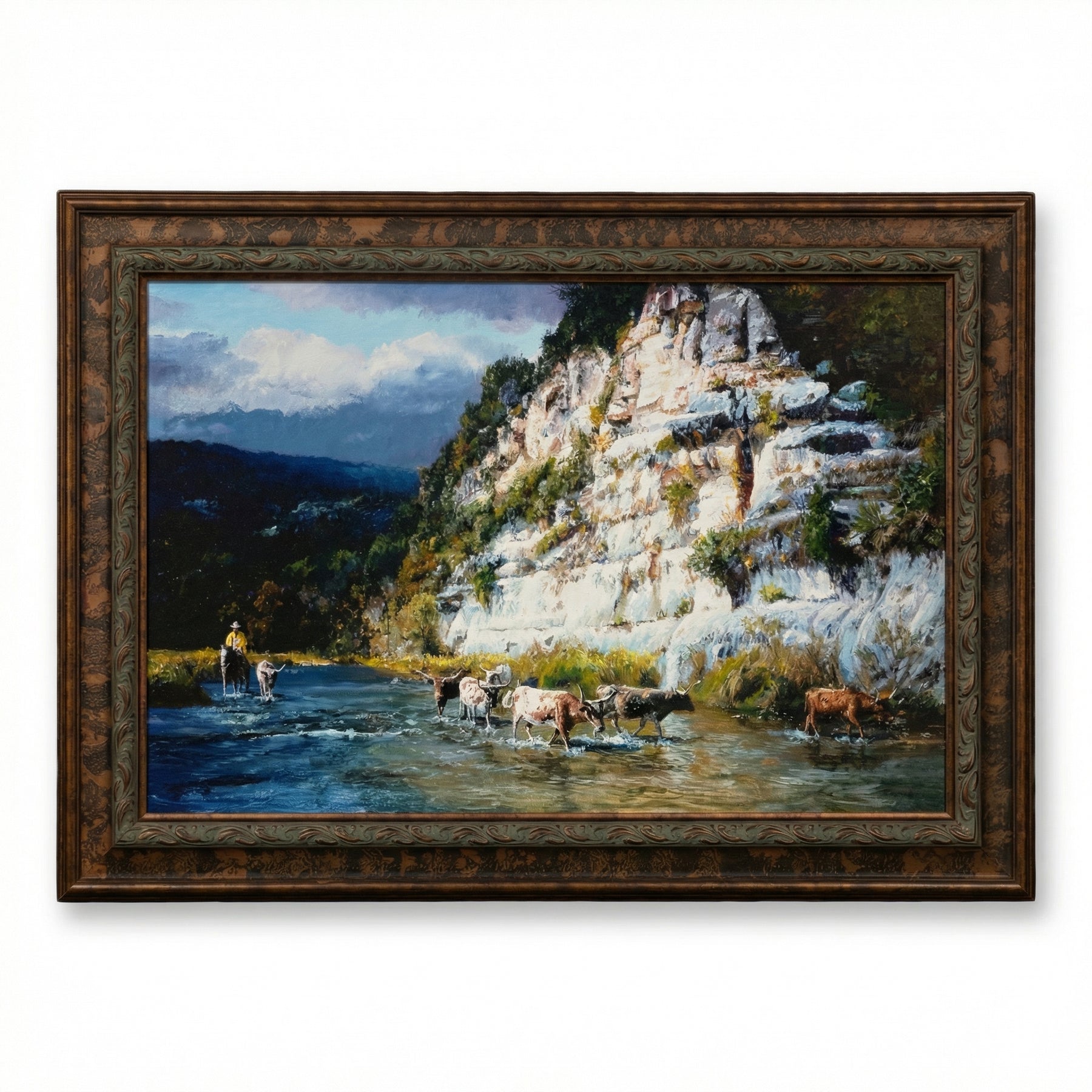 Hand-painted depiction of a cowboy and cattle by a scenic cliffside river