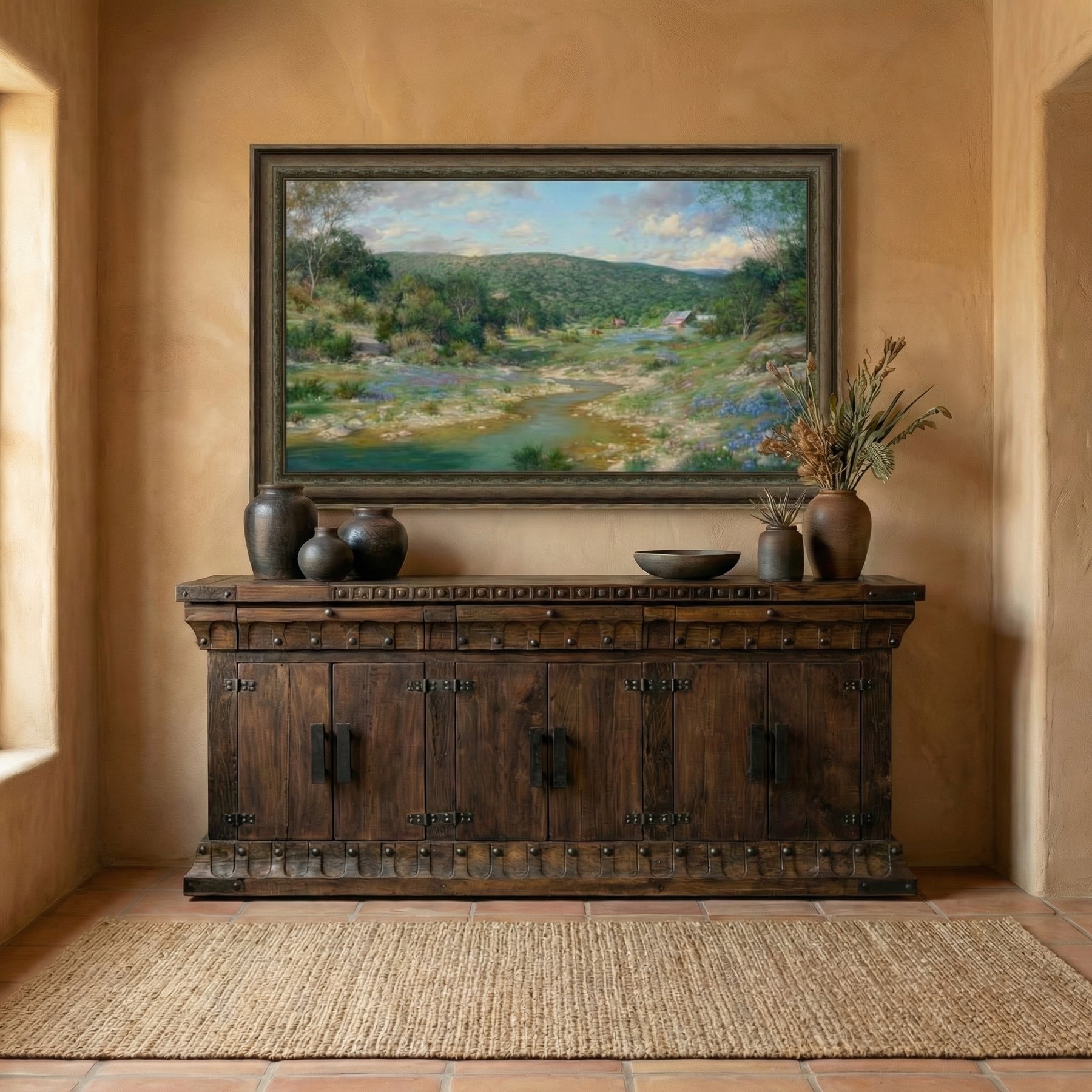 Experience the tranquil beauty of Texas with Deep In The Heart Art, a stunning landscape that celebrates the charm of rural life nestled in the Hill Country. This panoramic artwork showcases a crystal-clear creek meandering through a bed of wildflowers, with distant barns and tree-covered hills completing the idyllic setting. The peaceful palette of soft greens, vibrant blues, and warm earth tones evokes a sense of serenity and Southern pride.