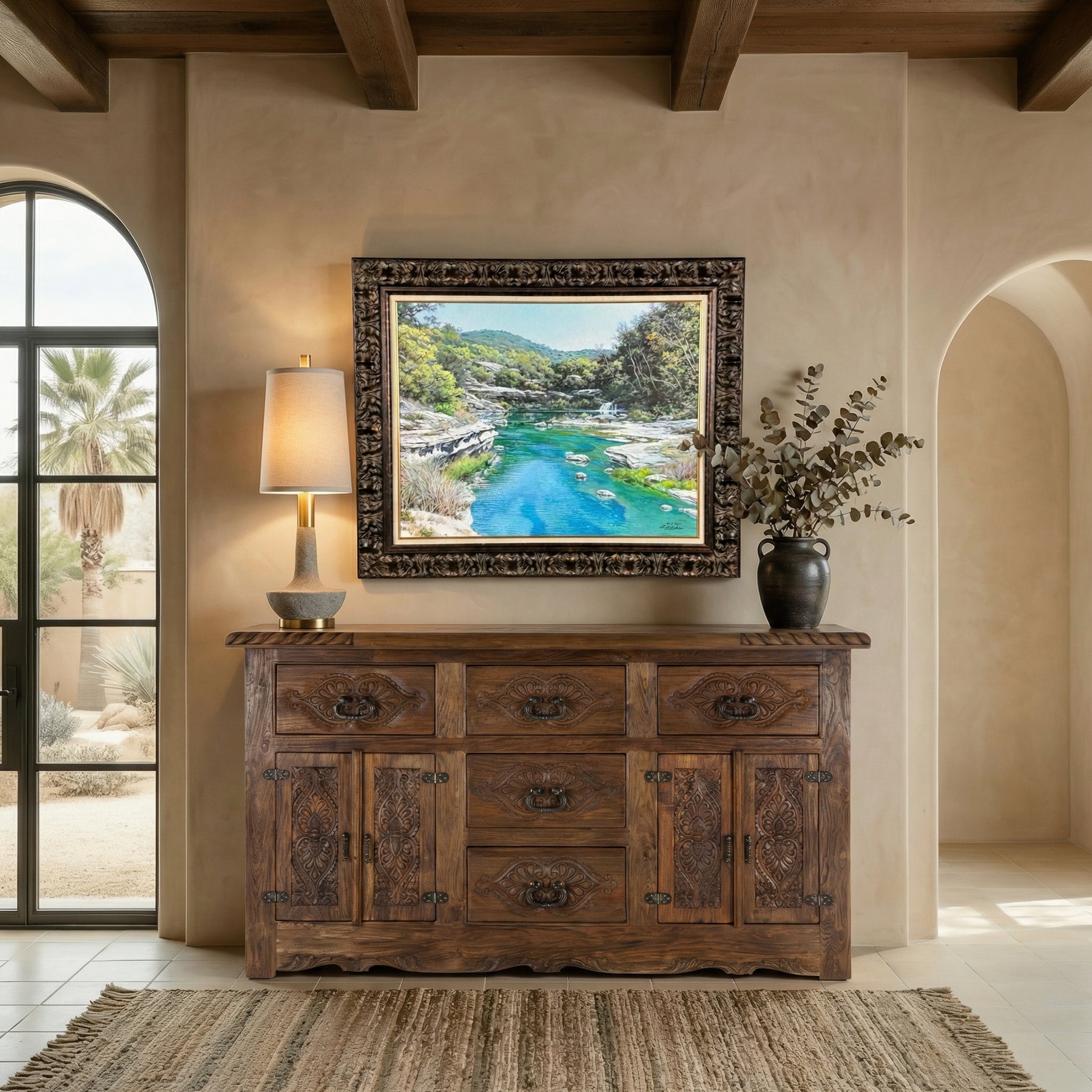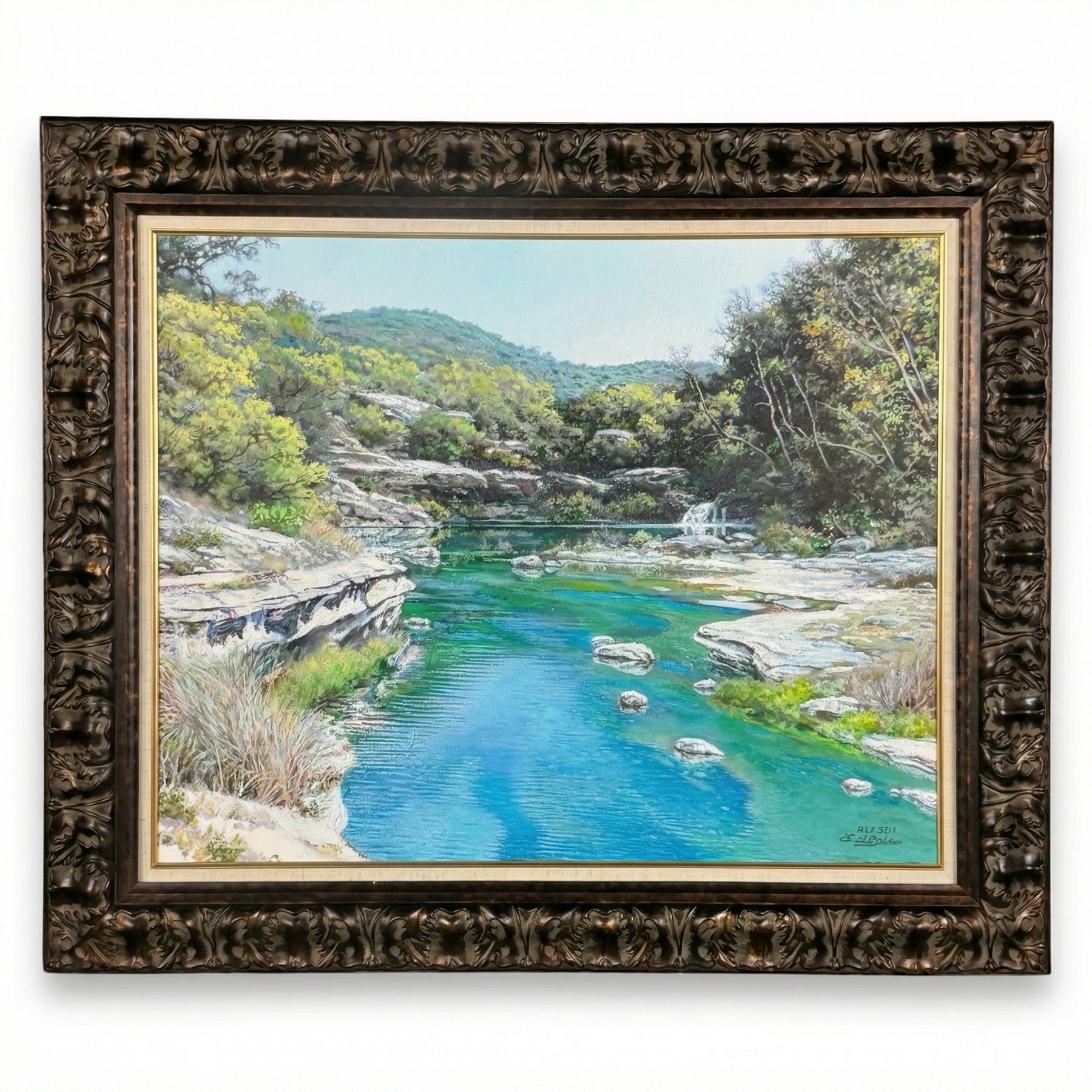 Immerse yourself in the tranquil beauty of the Texas Hill Country with Emerald Stream Art—a breathtaking landscape that captures the clarity and serenity of a secluded river oasis. Featuring crystal-clear turquoise waters, smooth limestone outcroppings, and lush greenery, this painting brings the peaceful essence of nature into any room. The ornate, dark-toned frame with gold accents enhances the artwork’s timeless appeal.