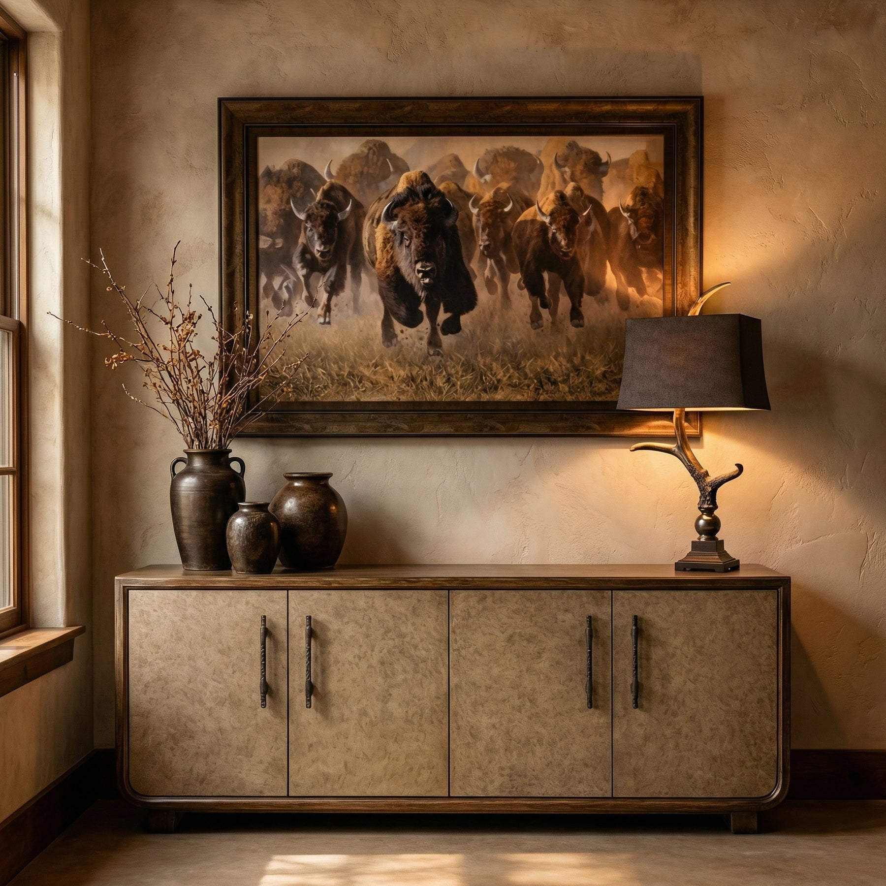 Dynamic wildlife art featuring a thundering bison stampede