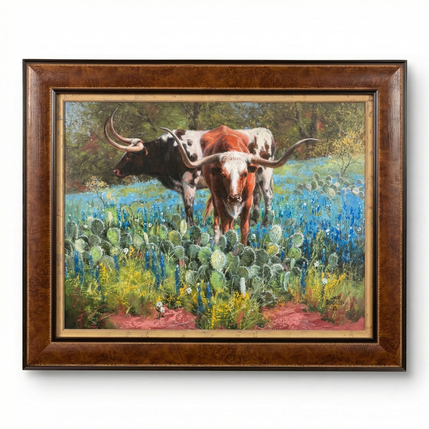 Rich with heritage and natural splendor, Goodnight Legacy honors the enduring spirit of Texas ranching. This captivating painting showcases two majestic longhorns standing proudly among blooming bluebonnets and prickly pear cactus, set against a lush wooded backdrop. The detailed brushwork and vibrant color palette celebrate the land, the livestock, and the legacy of Charles Goodnight—an icon of Texas cattle history. Framed in a warm wood finish with classic trim, this piece makes a bold and meaningful statement.