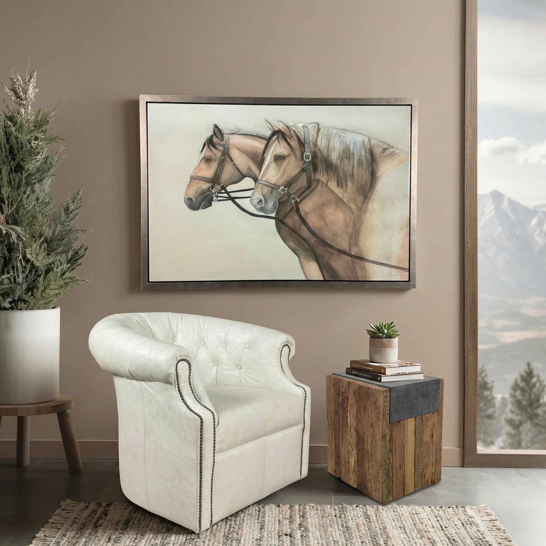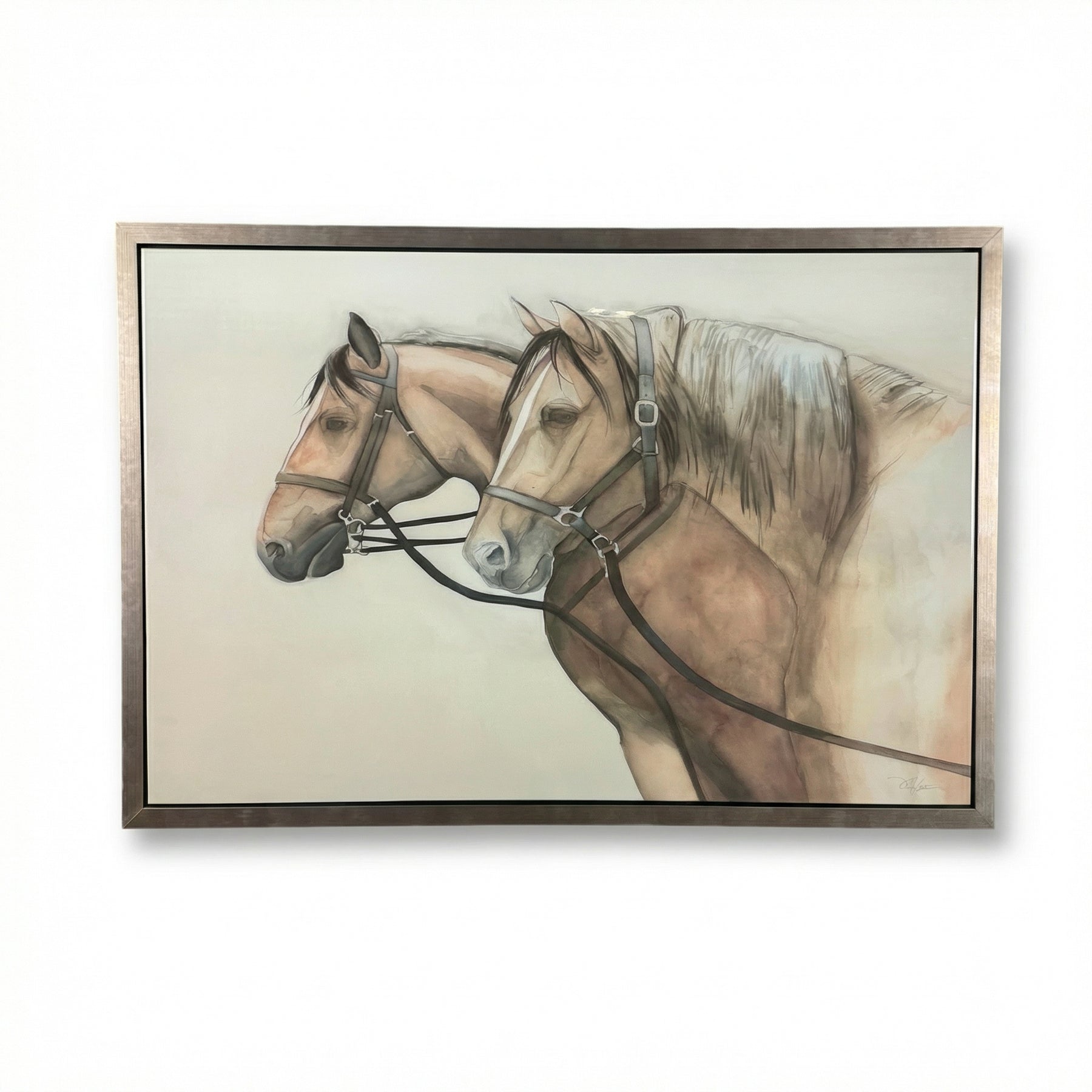 Graceful and serene, Les Deux Art beautifully captures the quiet strength and gentle companionship of two bridled horses in perfect harmony. Soft, painterly strokes and a muted color palette give this artwork an elegant, almost dreamlike quality. Framed in a sleek, neutral-toned border, this piece brings calm and sophistication to any space.