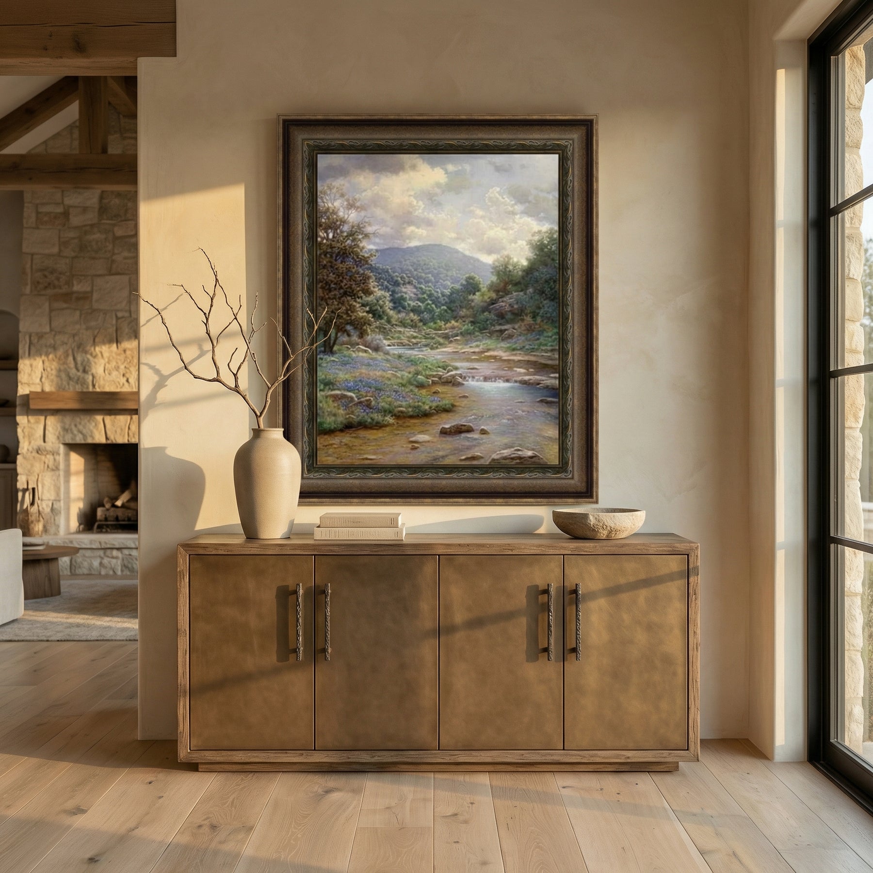 Bring peace and natural beauty into your space with Secluded Spring Art, a captivating vertical landscape that celebrates the quiet elegance of untouched nature. This artwork portrays a gentle stream winding through wildflowers, rocky banks, and wooded hills under a sky filled with soft, billowing clouds. The subtle play of light and color evokes a refreshing calm, making it the perfect centerpiece for any room in need of serenity.