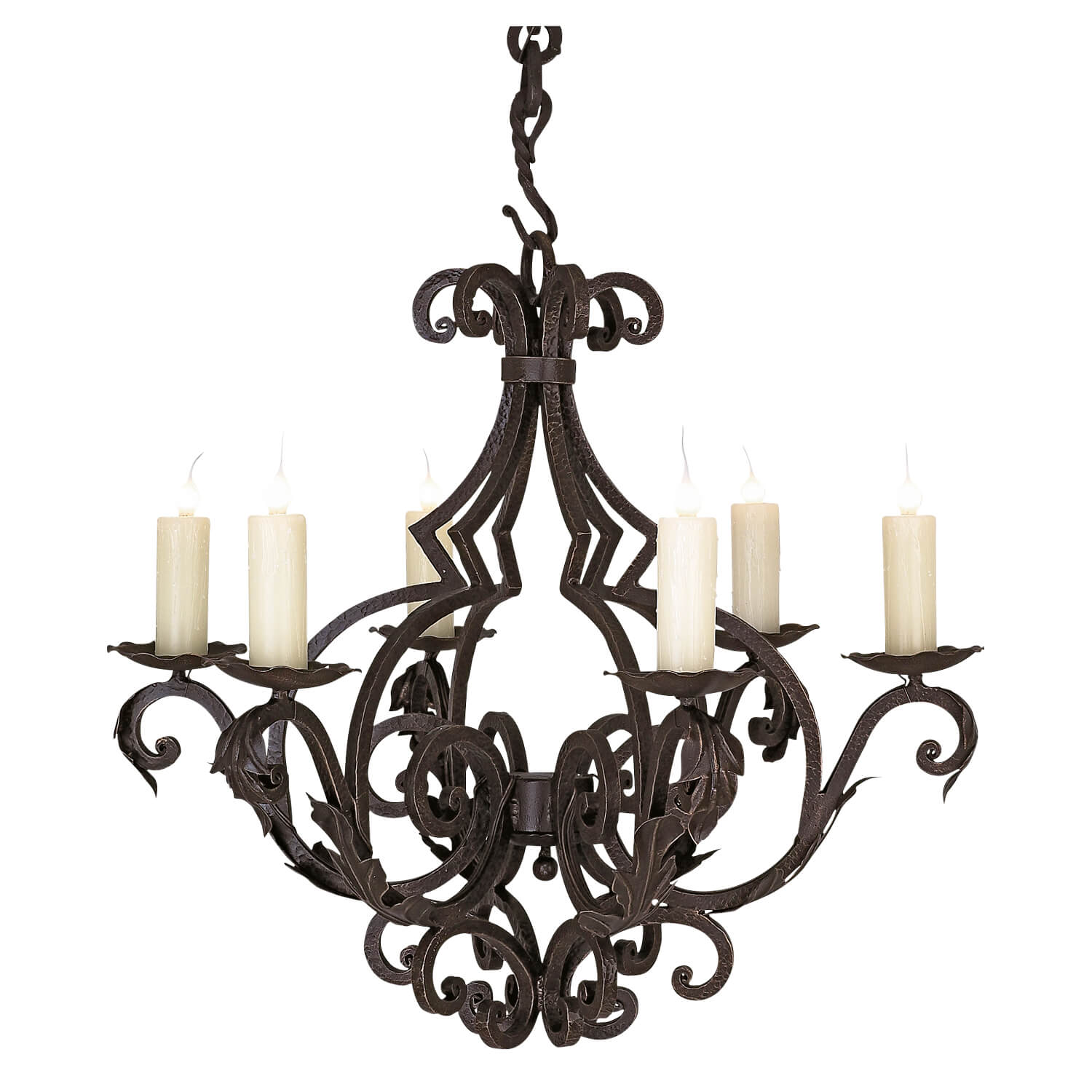 Bold and sculptural, the Harris Chandelier is a striking expression of hand-forged craftsmanship. With its distinctive zigzag crown, sweeping scroll arms, and finely detailed leaf accents, this 6-light chandelier blends gothic flair with artistic elegance. The candle-style lights rest atop petal-edged bobeches, casting a warm, welcoming glow—perfect for enhancing entryways, dining rooms, or cozy conversation areas.