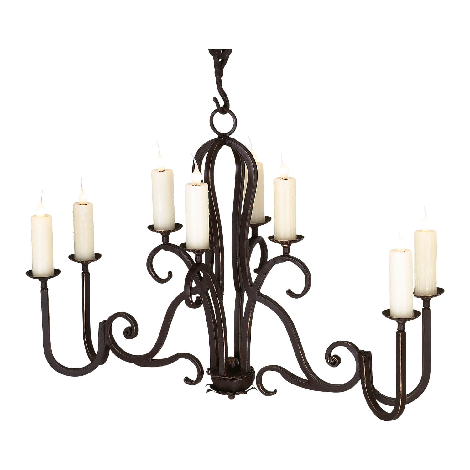 Understated elegance meets graceful form in the Addi Chandelier — an 8-light fixture that brings timeless charm to any room. Hand-forged from wrought iron, its sweeping arms, fluid scrollwork, and upright candle-style lights offer a refined silhouette with rustic appeal. The clean curves and minimalist structure make it an ideal addition to both traditional and transitional spaces.