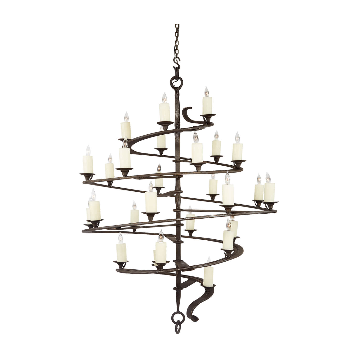 Command attention with the breathtaking design of the Caesar Spiral Chandelier. This extraordinary fixture features a dynamic, spiraling form that descends with sculptural grace. Forged from hand-worked iron and finished in a rich bronze patina, the Caesar showcases candle-style lights arranged along its helical frame to cast warm, ambient light from every angle.