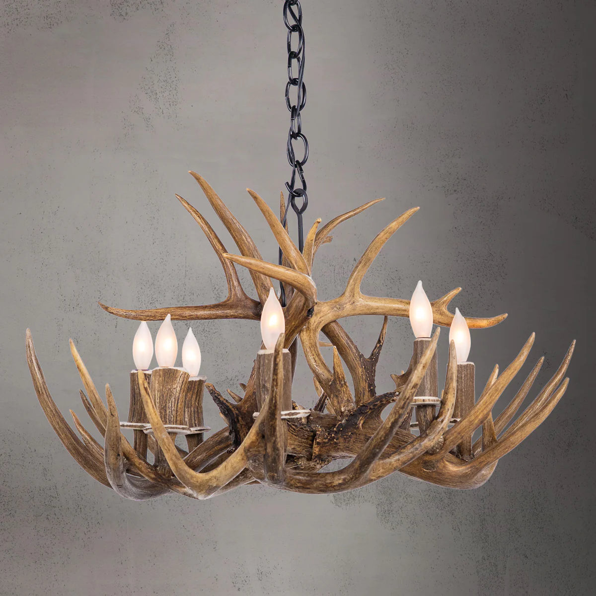 Each chandelier is individually crafted, ensuring no two are alike and celebrating the authentic character of the American West. UL and CUL listed, dimmer-compatible, and built for 110–120V.