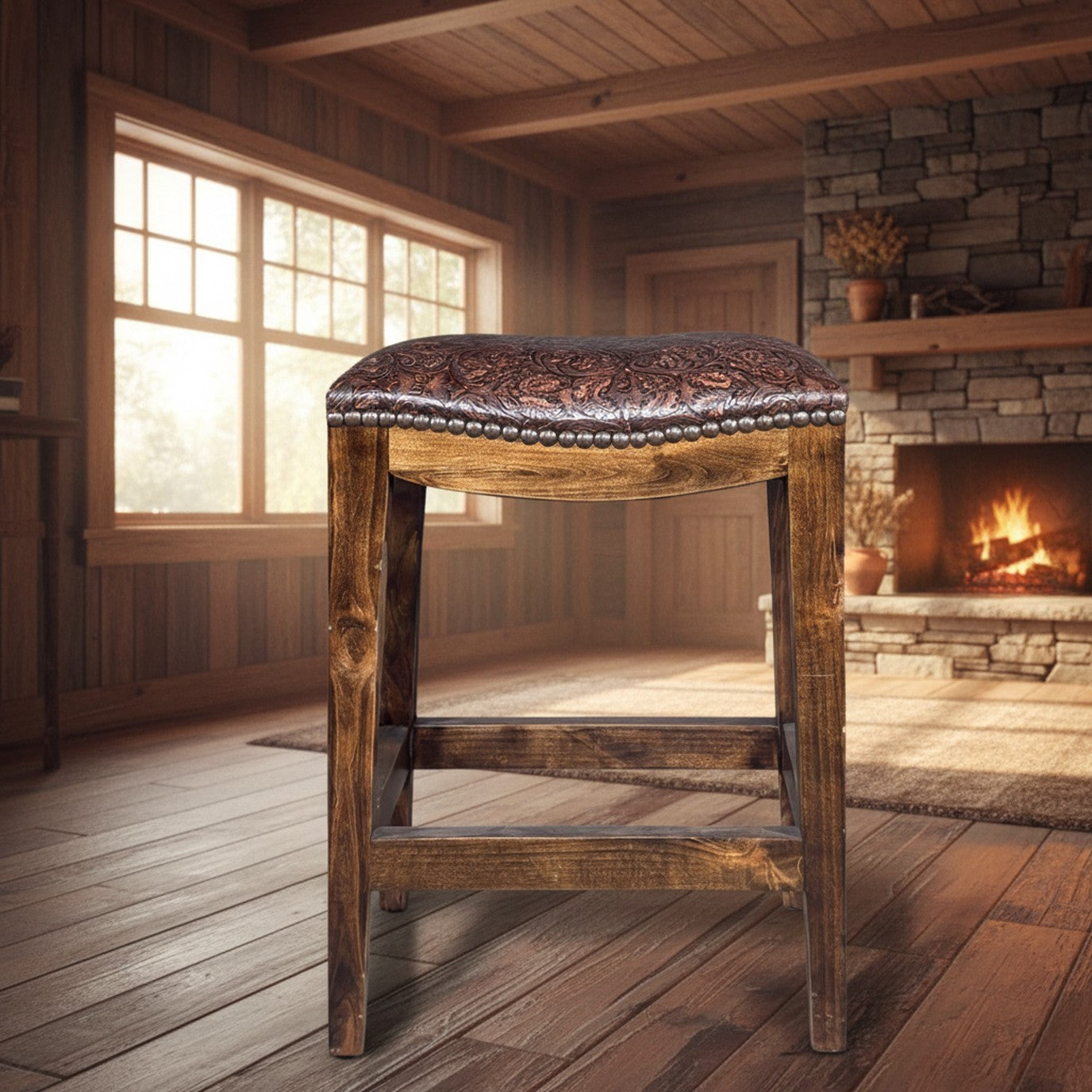 Bring the rugged charm of the American West into your home with the Denali Ranch Cowboy Tooled Stool. This handcrafted piece embodies timeless craftsmanship, blending rustic elegance with functionality. The stool features a hand-tooled leather seat, intricately detailed with Western-inspired floral patterns that reflect the spirit of classic saddlery work. Each tooled leather top is unique, showcasing the natural variations in texture and tone that make every piece special.