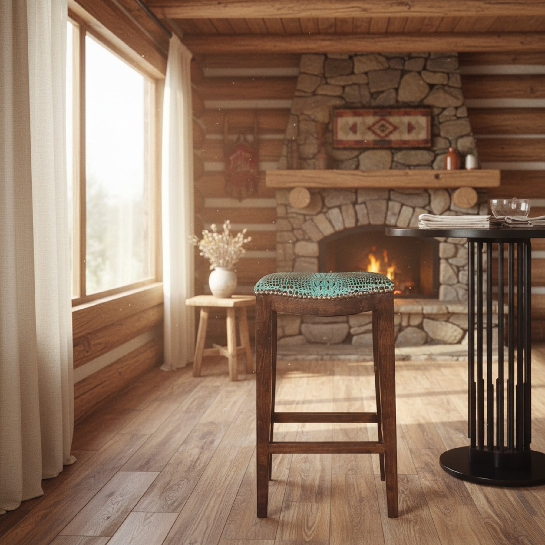 The Denali Ranch Croc Turquoise Stool brings bold western elegance to any space with its eye-catching turquoise croc-embossed leather seat and handcrafted rustic wood frame. Finished in a rich chestnut stain, the solid alder wood base provides durability and warmth, while the hand-set nailhead trim adds a touch of refined detail. This backless saddle-style stool is available in both bar and counter heights, making it a perfect fit for kitchen islands, home bars, or commercial spaces seeking a distinctive, upscale ranch aesthetic.
