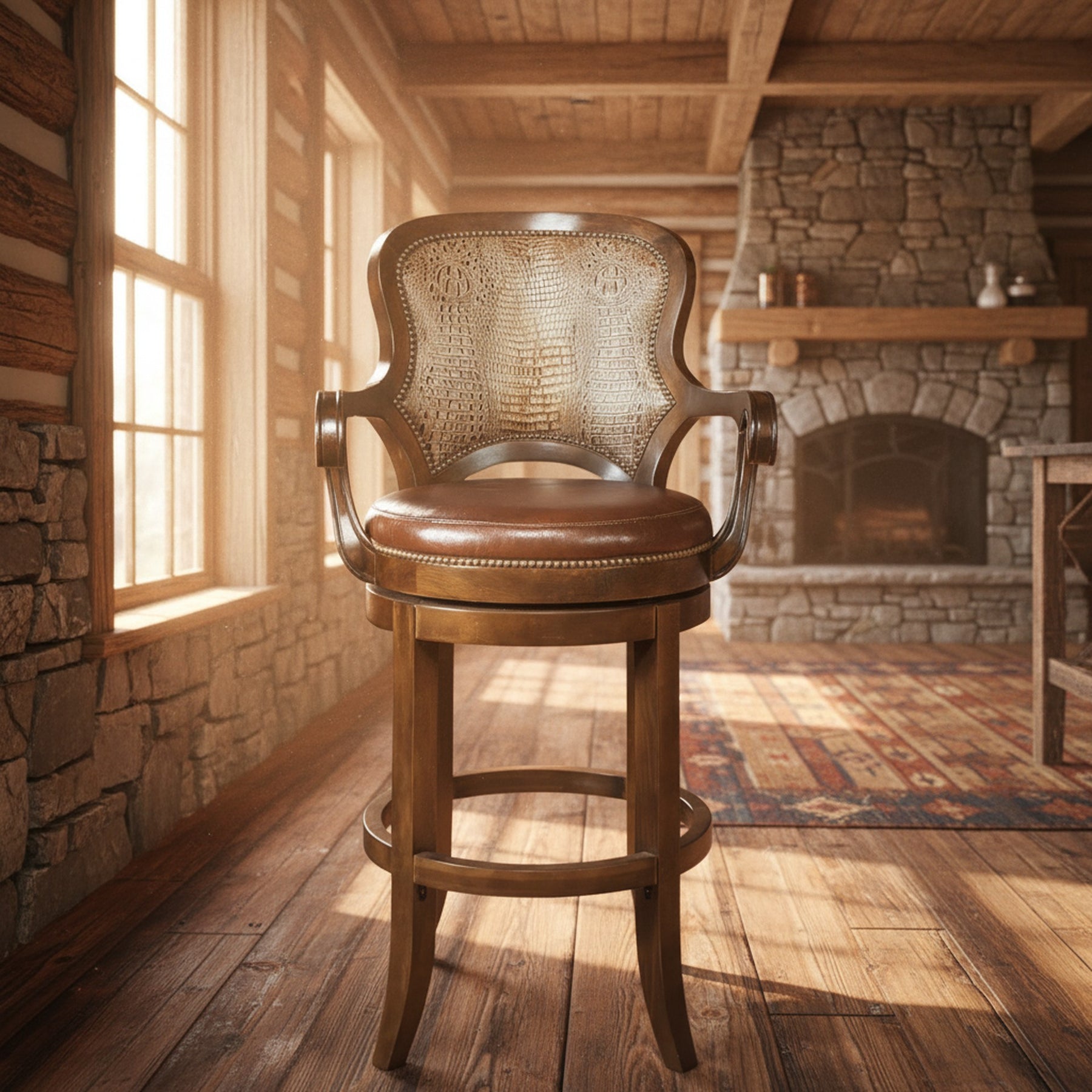 Bring a touch of rustic refinement to your home with the Denali Ranch Honolulu Chocolate Stool. This elegantly crafted stool features a sturdy wooden frame, gracefully curved arms, and a padded leather seat in a rich chocolate hue. The distinctive croc-embossed leather backrest adds a bold, textured accent, while the hand-applied nailhead trim along the edges provides a timeless finishing touch. Perfect for adding warmth and sophistication to your bar or kitchen island, this stool effortlessly combines rugged charm with lasting comfort.