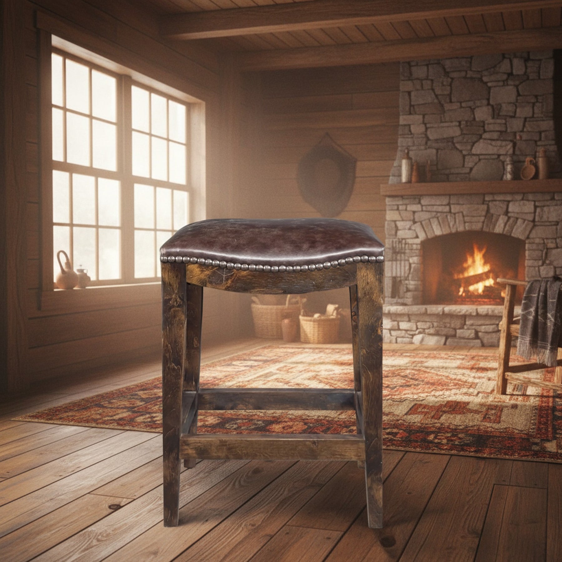 The Denali Ranch Tuscany Lodge Saddle Stool blends rustic charm with timeless craftsmanship. Featuring a contoured, saddle-style seat upholstered in rich, dark brown leather, this stool offers exceptional comfort and classic style. The sturdy hardwood frame showcases a warm, hand-finished stain, highlighting the natural grain and character of the wood. Decorative nailhead trim along the seat adds a refined, handcrafted touch, while the footrest ensures support and ease for everyday use.