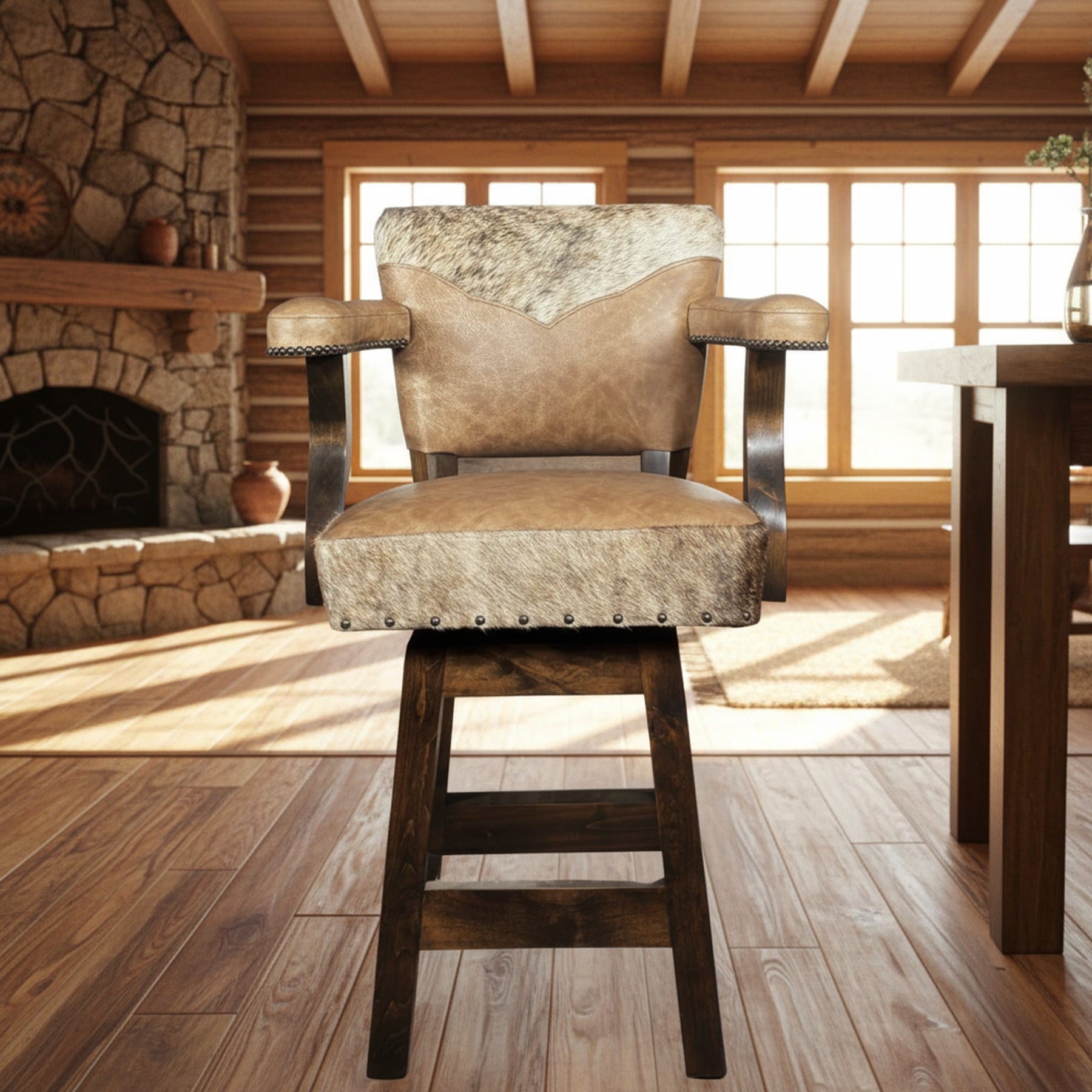 Add a touch of Western charm and natural texture to your bar or kitchen with the Denali Ranch Light Tan Brindle Stool. This handcrafted piece showcases a warm, light tan leather seat paired with genuine brindle cowhide on the backrest and seat border, making each stool truly one of a kind. The curved arms and solid wood frame are accented with antique nailhead trim for a rustic yet refined look.