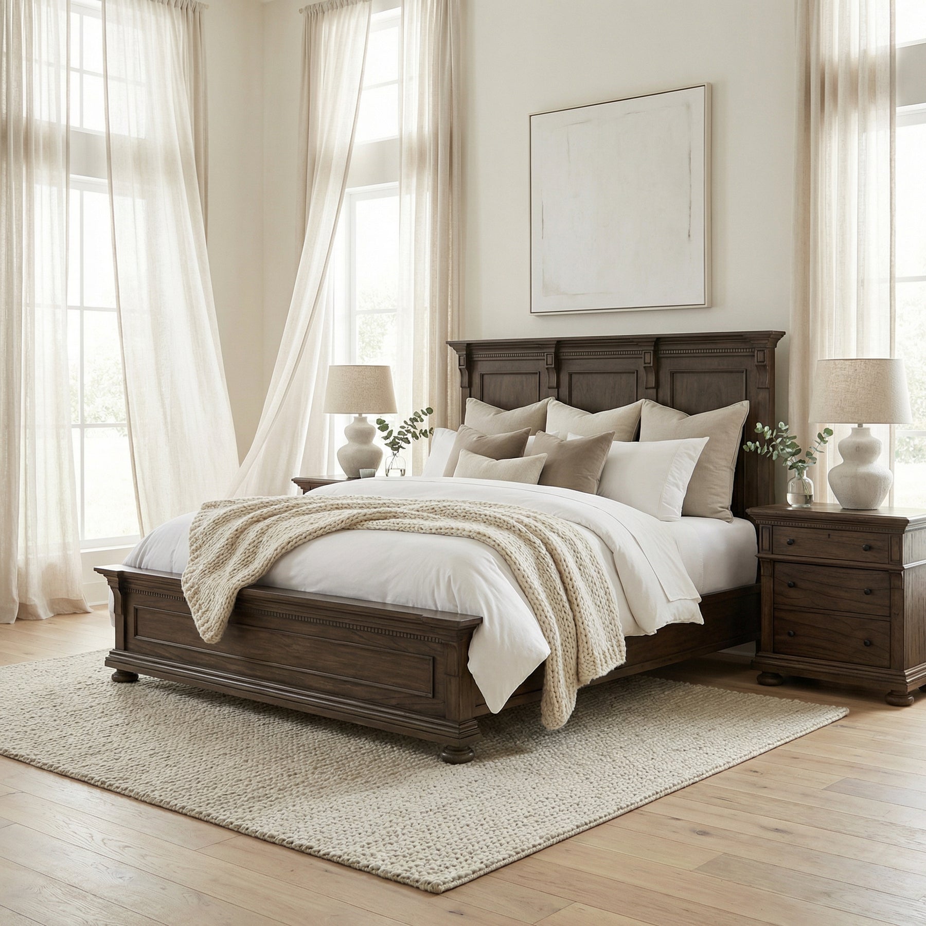 Elegant and enduring, the Java King Bed combines classic panel design with a deep, espresso-toned wood finish for a look that’s both timeless and sophisticated. The grand headboard features three recessed panels with decorative trim and corbel-style detailing, creating a stately architectural presence. A matching footboard with dentil molding and molded base completes the look, offering a luxurious yet grounded centerpiece for any master suite.