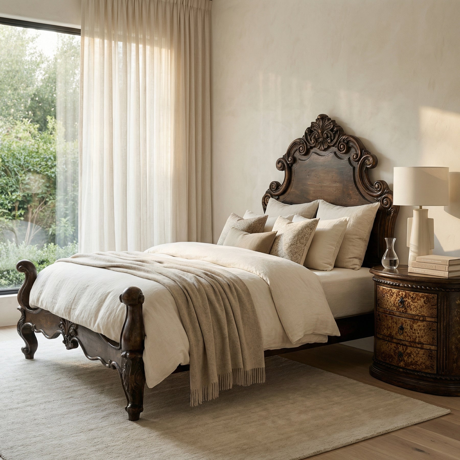 The Marqueza Bed blends old-world charm with refined craftsmanship, serving as a true heirloom centerpiece for any luxury bedroom. Hand-carved from solid wood, it features intricate scrollwork and ornate detailing along the headboard and footboard, all highlighted by a rich, multi-tone finish. Its regal silhouette—with sweeping curves, sculpted accents, and a balance of European elegance and rustic Hill Country influence—brings both sophistication and warmth to any space.