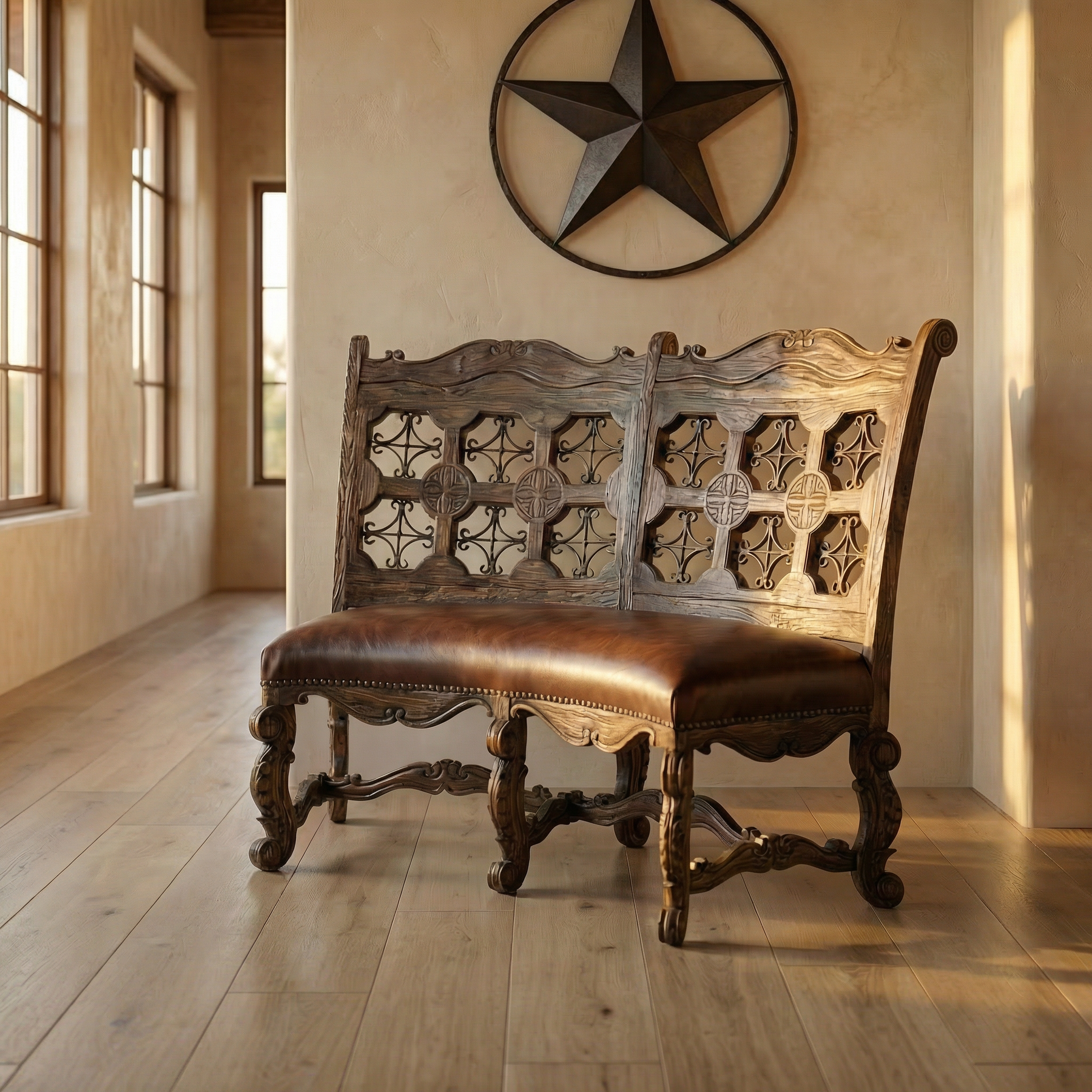 Graceful curves, handcrafted details, and rich textures define the Iron Star Curved Bench with Leather Seat. This exquisite piece features a beautifully carved solid wood frame paired with an arched back inset with wrought iron star medallion motifs, lending a bold yet elegant presence. The luxuriously padded leather seat adds comfort and sophistication, making it a stunning choice for entryways, dining areas, or accent seating.