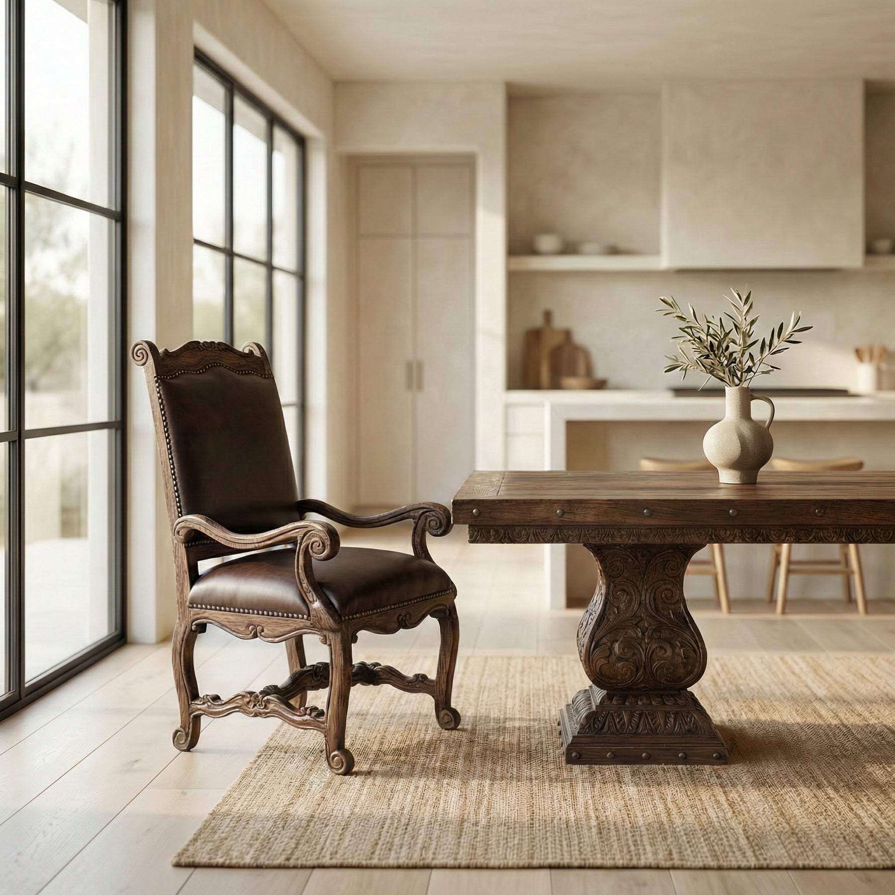 Experience timeless elegance with the Dining Arm Chair with Leather, a refined addition to any dining space. Featuring a hand-carved wooden frame with intricately scrolled arms and legs, this chair exudes classic sophistication. Upholstered in rich, premium leather, it offers both style and comfort, making it perfect for formal dining settings or upscale casual dining areas.
