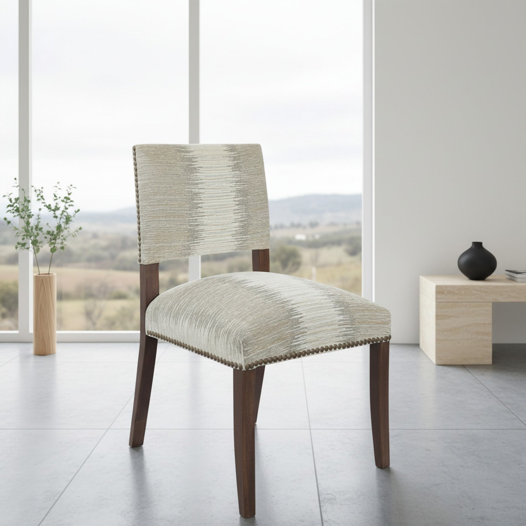 The Taupe Lines Liam Side Chair brings refined simplicity to your dining or living space. Upholstered in a soft, textural fabric with a subtle linear pattern in shades of taupe and cream, this chair offers a calm, contemporary look. The gently curved seat and padded back provide comfort and support, while antique brass nailhead trim adds a classic touch. Set on warm wood legs, the Taupe Lines Liam Side Chair pairs beautifully with both modern and rustic interiors.