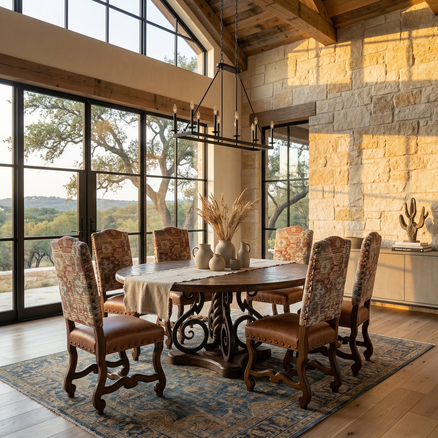 The Tahoma Flame Crown Side Chair merges old-world elegance with rustic sophistication. Its high, arched back is upholstered in a vibrant tapestry-style fabric, blending rich red, gold, and slate tones in a bold, abstract pattern. A hand-finished leather seat adds warmth and comfort, enhanced by antique brass nailhead trim. The sculpted wood base features a deep, carved stretcher and gracefully curved legs, making this chair a refined yet grounded choice for dining rooms or statement seating.