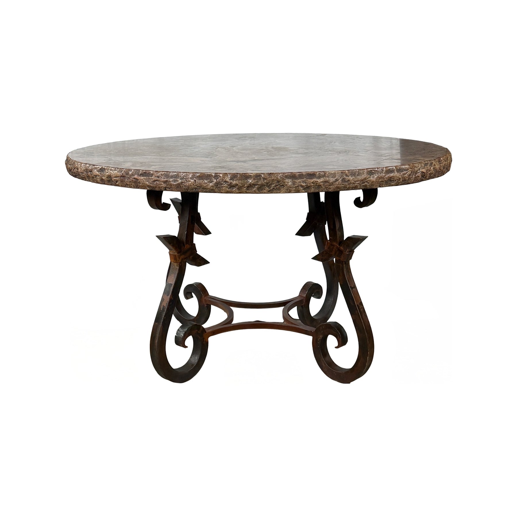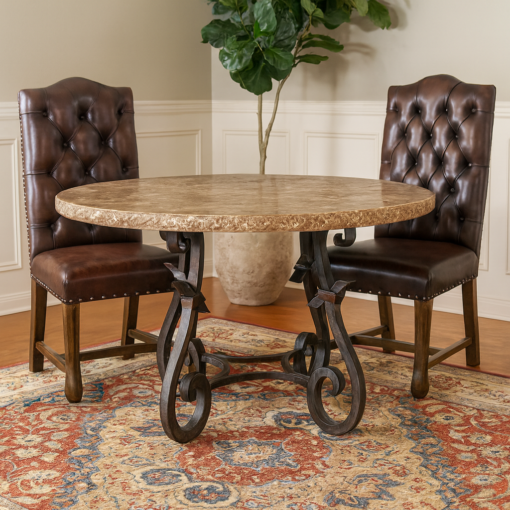 Blending rustic elegance with timeless craftsmanship, the Travertine Top with Montecillo Iron Base showcases a stunning combination of natural stone and hand-forged artistry. The genuine travertine top features rich texture and organic veining, while the intricately scrolled Montecillo iron base adds depth, durability, and a touch of old-world charm. Perfect for both intimate dinners and grand gatherings, this piece anchors any dining space with strength and sophistication — a signature look of Hill Country luxury.
