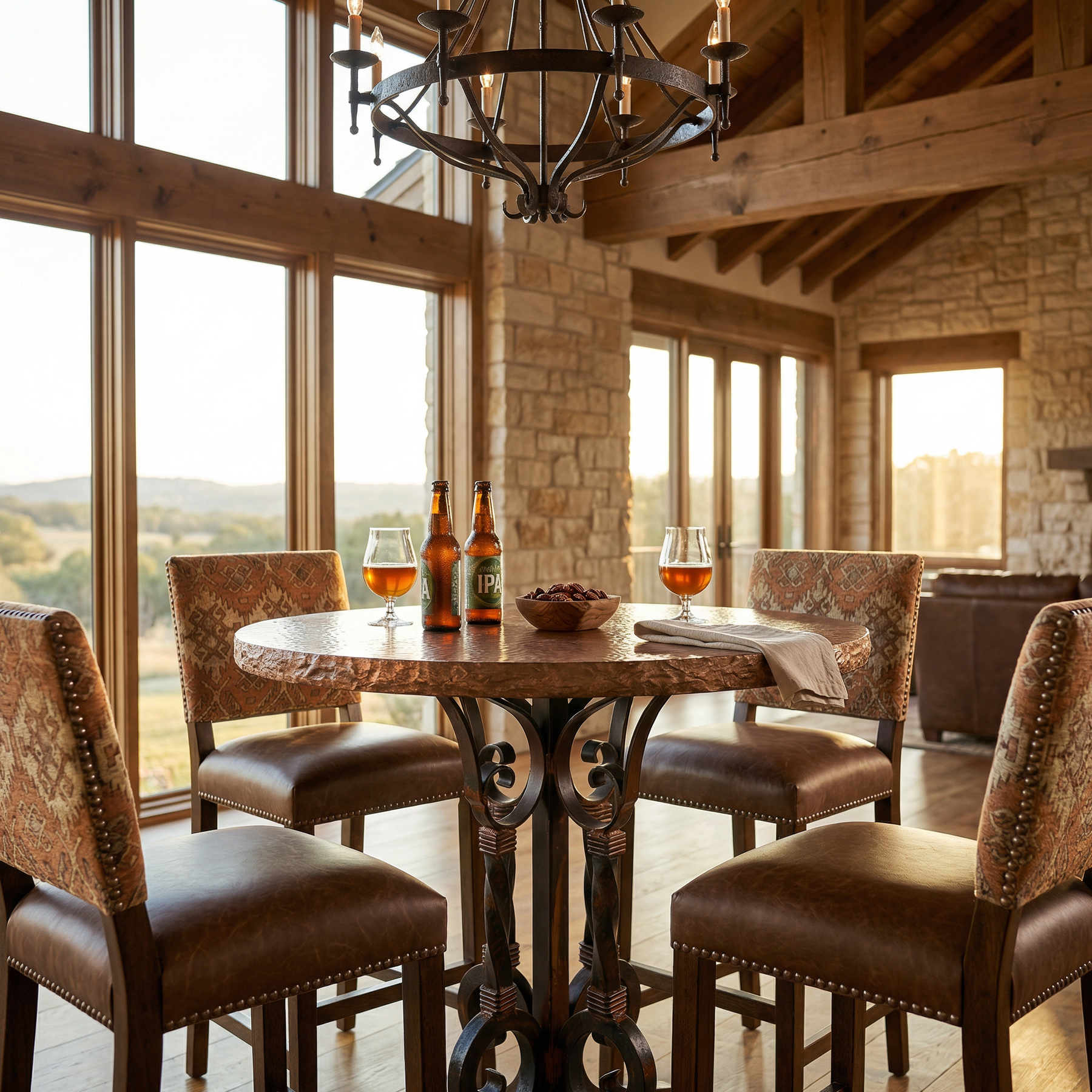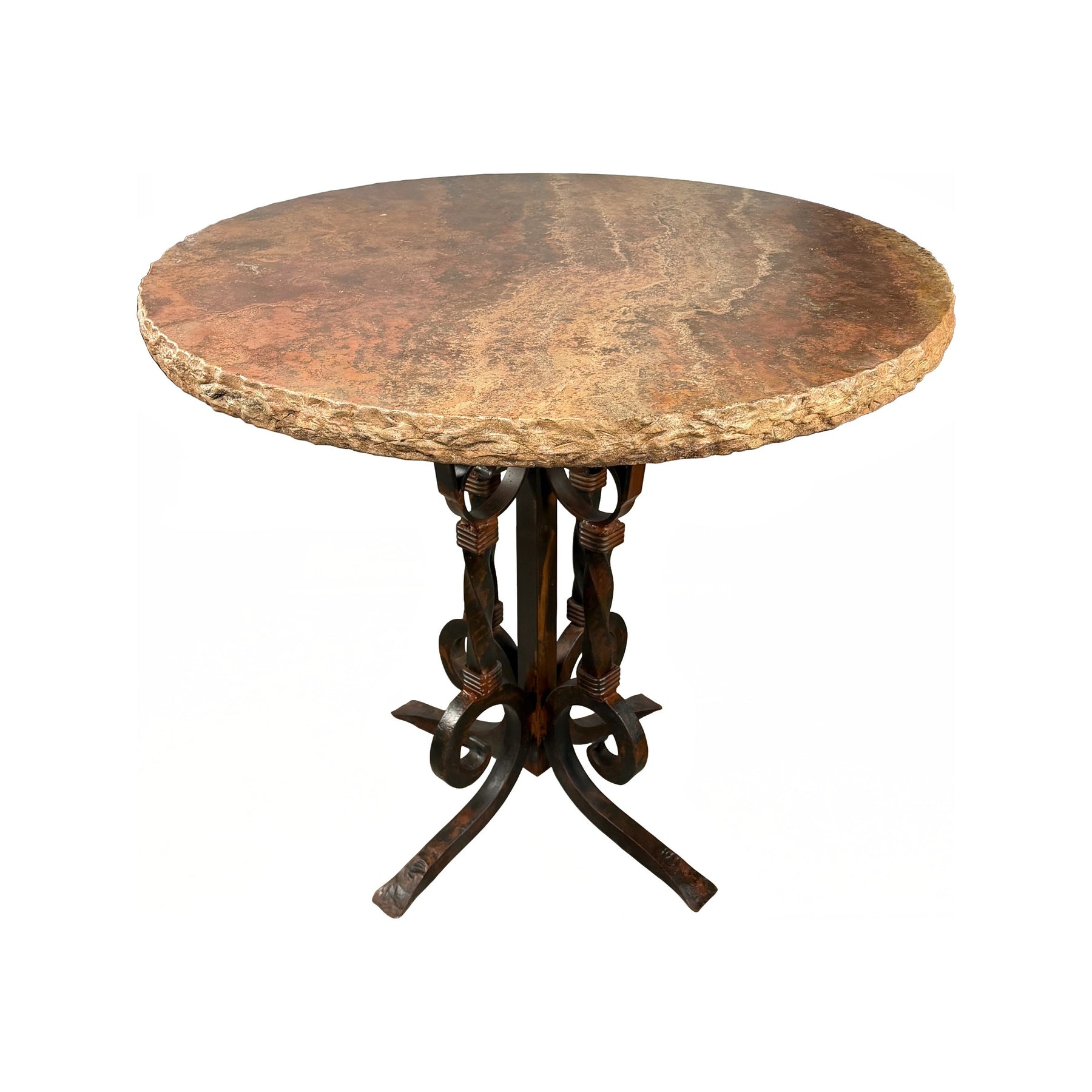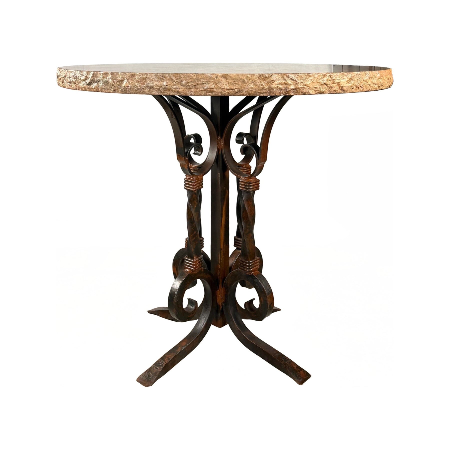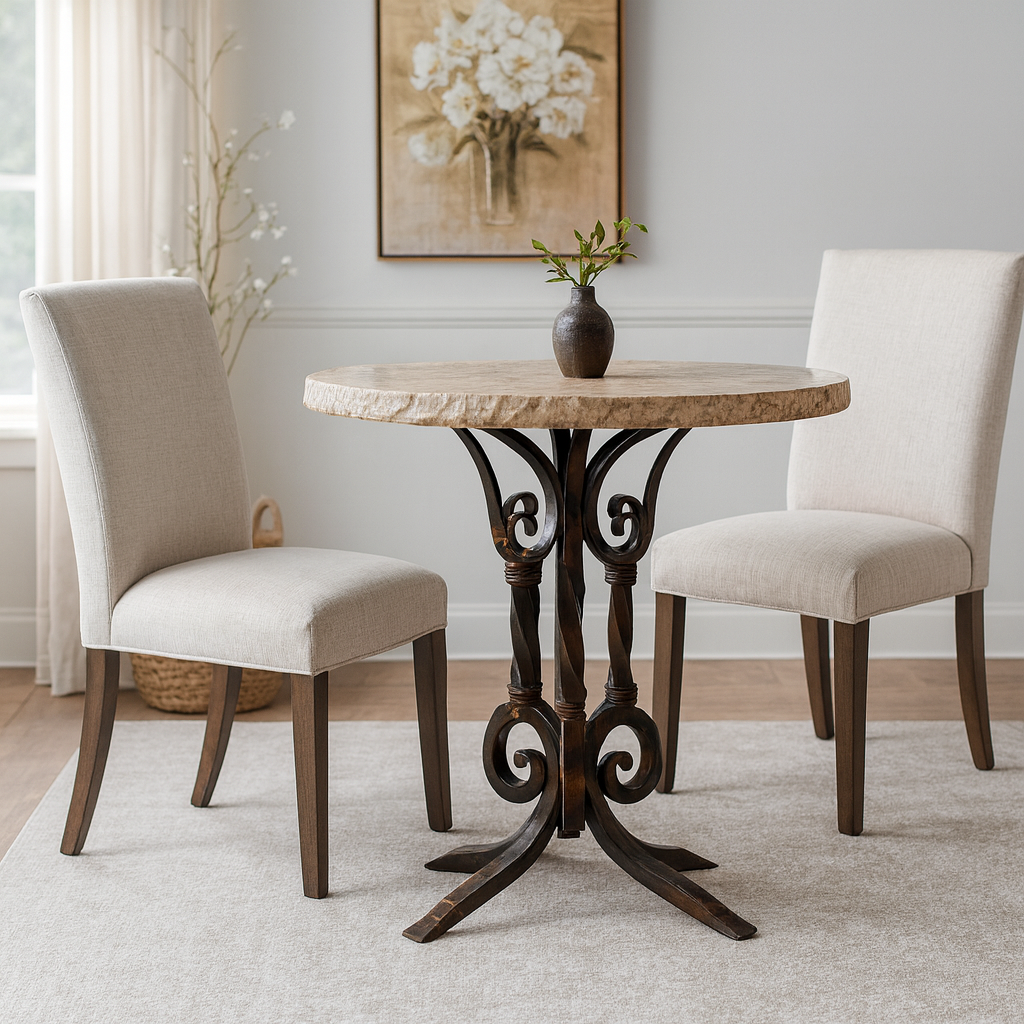 The Travertine Top w/ Costella Iron Base embodies refined rustic elegance. Crafted with a genuine travertine stone top, its natural veining and hand-chiseled edge showcase earthy tones and organic texture. The intricate Costella iron base, featuring hand-forged twists and scrollwork, adds a sculptural, artisan touch with exceptional strength and craftsmanship.