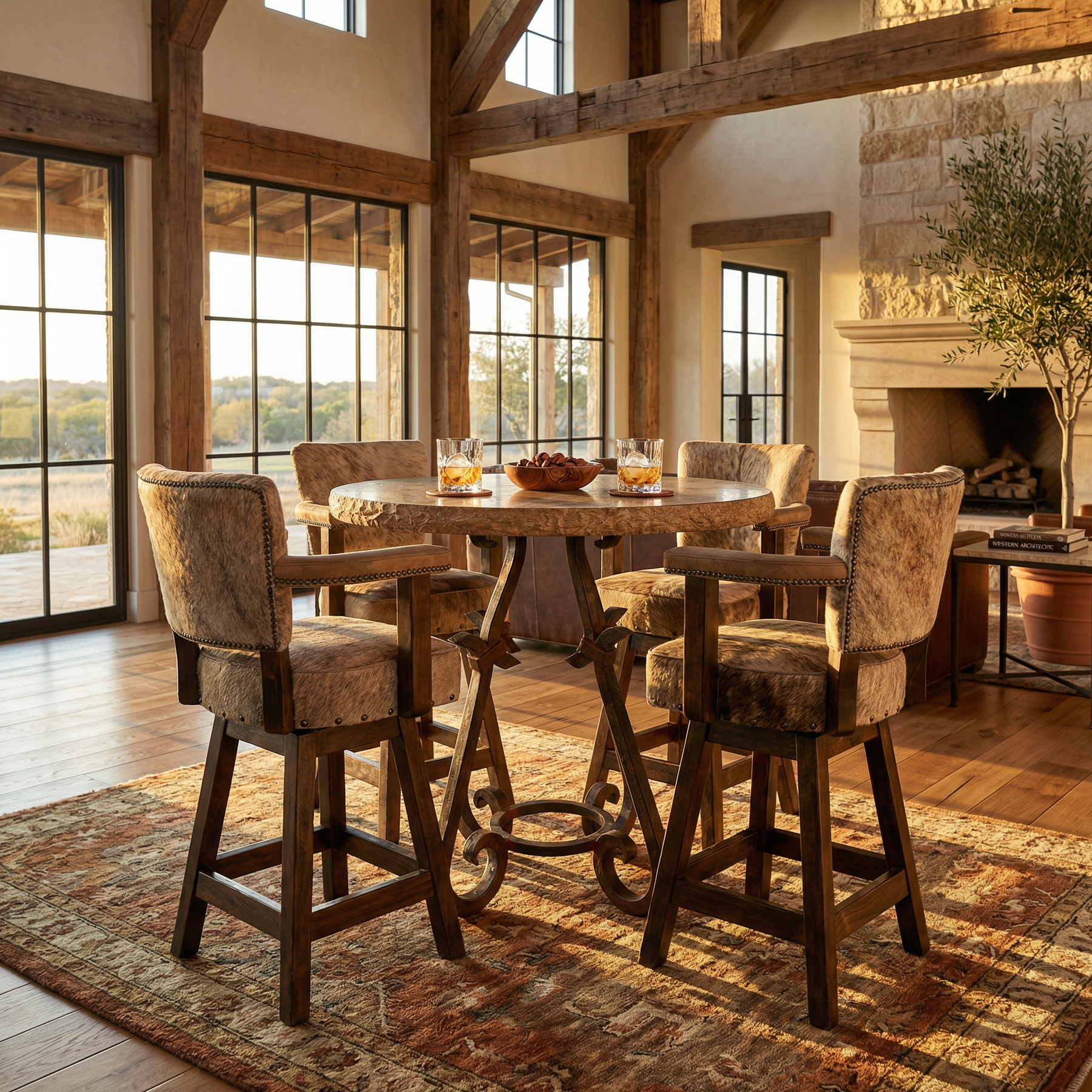 The Travertine Top w/ Montecillo Iron Pub Base captures the perfect balance of natural elegance and handcrafted artistry. Featuring a genuine travertine stone top with rich, earthy tones and a hand-chiseled edge, this table exudes rustic sophistication. The Montecillo iron base showcases a beautifully forged design with curved lines and bold detailing, offering strength and timeless appeal. Ideal for dining areas, bar spaces, or as a statement accent piece, this table brings classic Hill Country charm and enduring craftsmanship to any space.