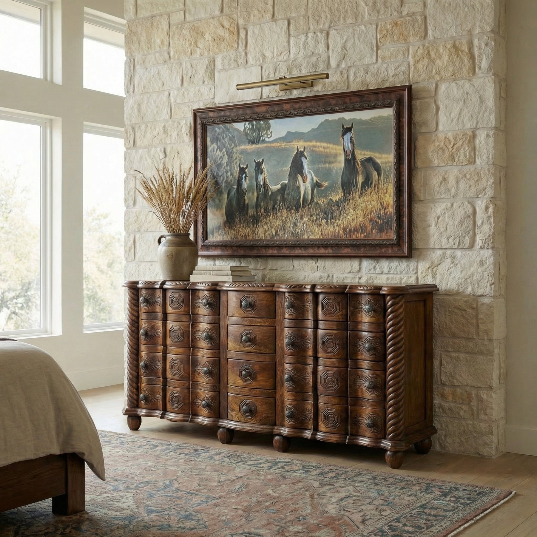 A grand expression of artisan craftsmanship, the Southern Twist 12-Drawer Dresser is both bold and beautiful. With its stately width and intricate hand-carved drawer fronts, this piece brings Old World charm into modern interiors. The distinctive twisted rope columns, bun feet, and ornate motifs lend a regal presence, while twelve spacious drawers provide ample storage for any room.