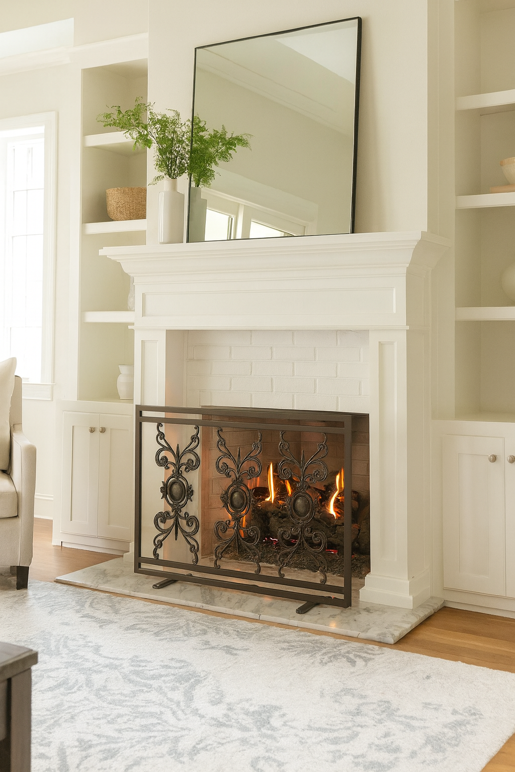 Make a bold statement with the Castilian Crest Fireplace Screen, where regal design meets artisan craftsmanship. This striking piece features three ornate medallion panels with intricate scrollwork and pointed finials, all framed in a clean, squared iron border. Finished in a rich bronze tone, it brings a sense of Old World grandeur and sophistication to any hearth.