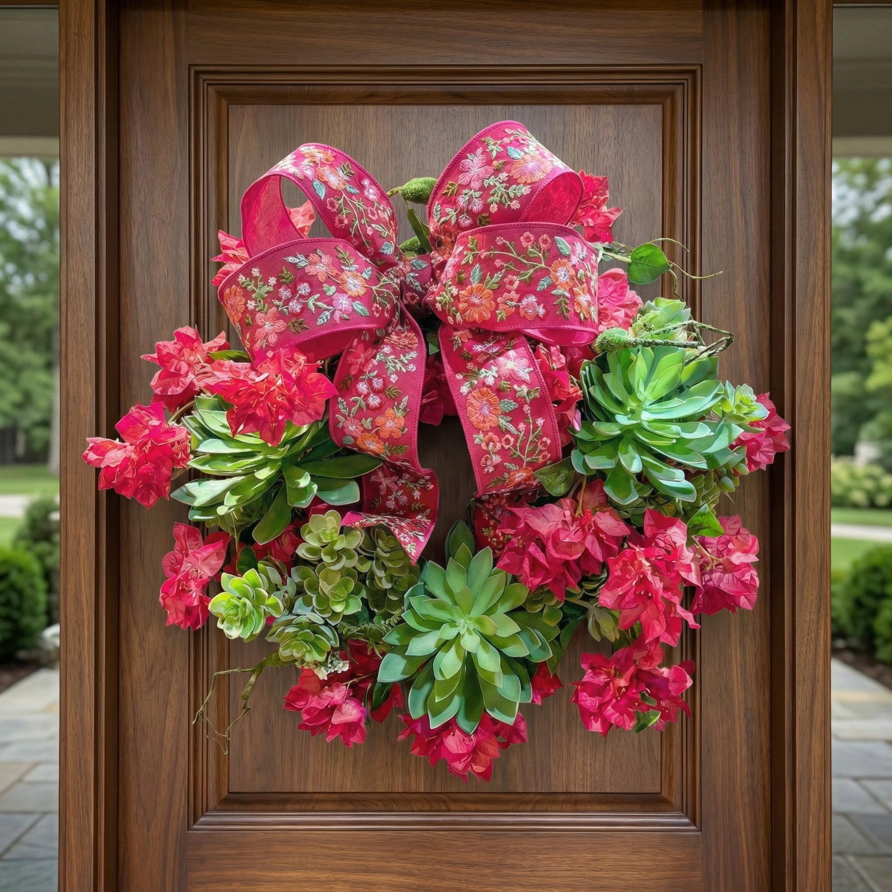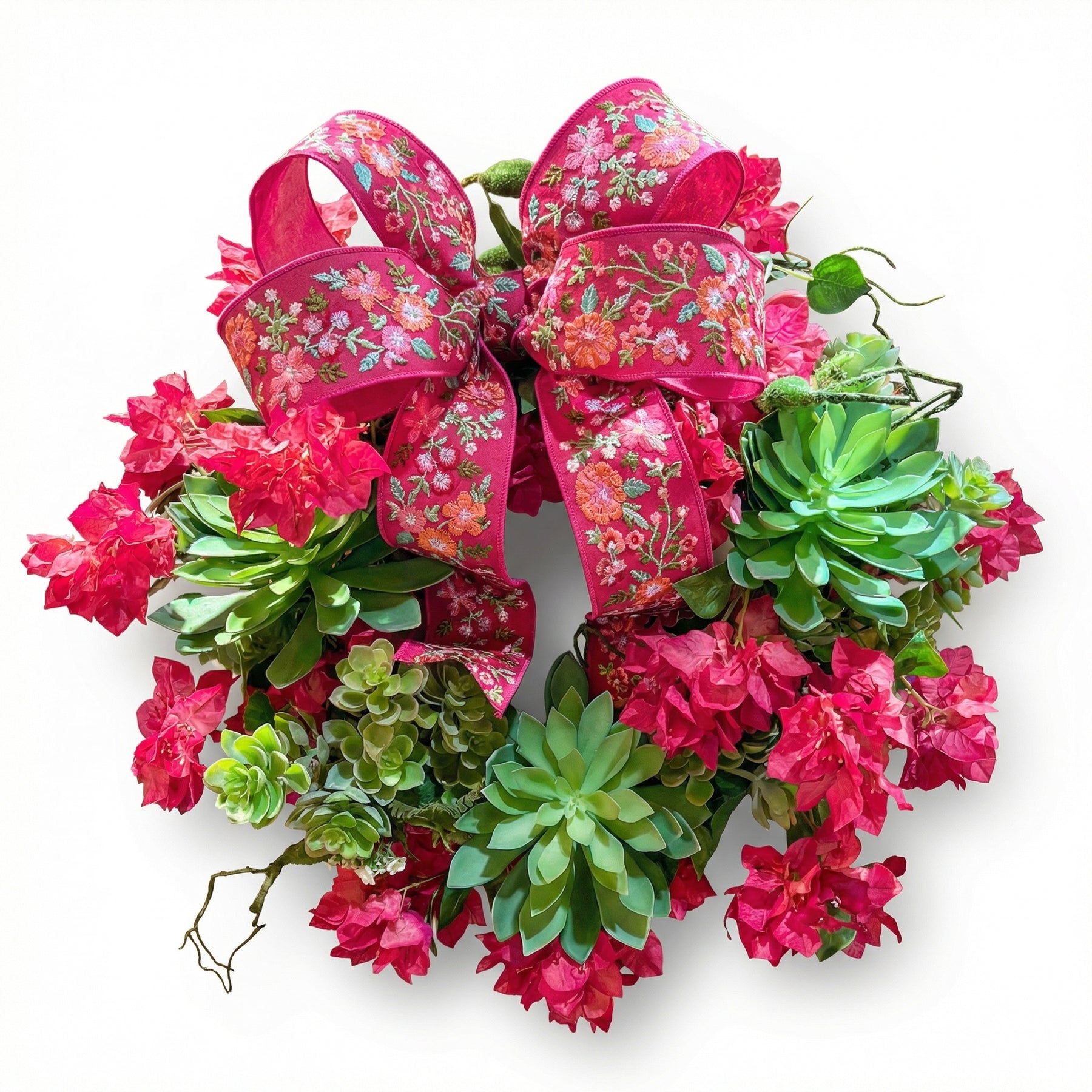 The Bougainvillea Rose Wreath is a striking celebration of color and texture, designed to bring warmth and energy to any grand entry. Rich bougainvillea-inspired blooms in vivid rose tones are layered with sculptural green succulents, creating a bold yet balanced arrangement that feels fresh and refined.