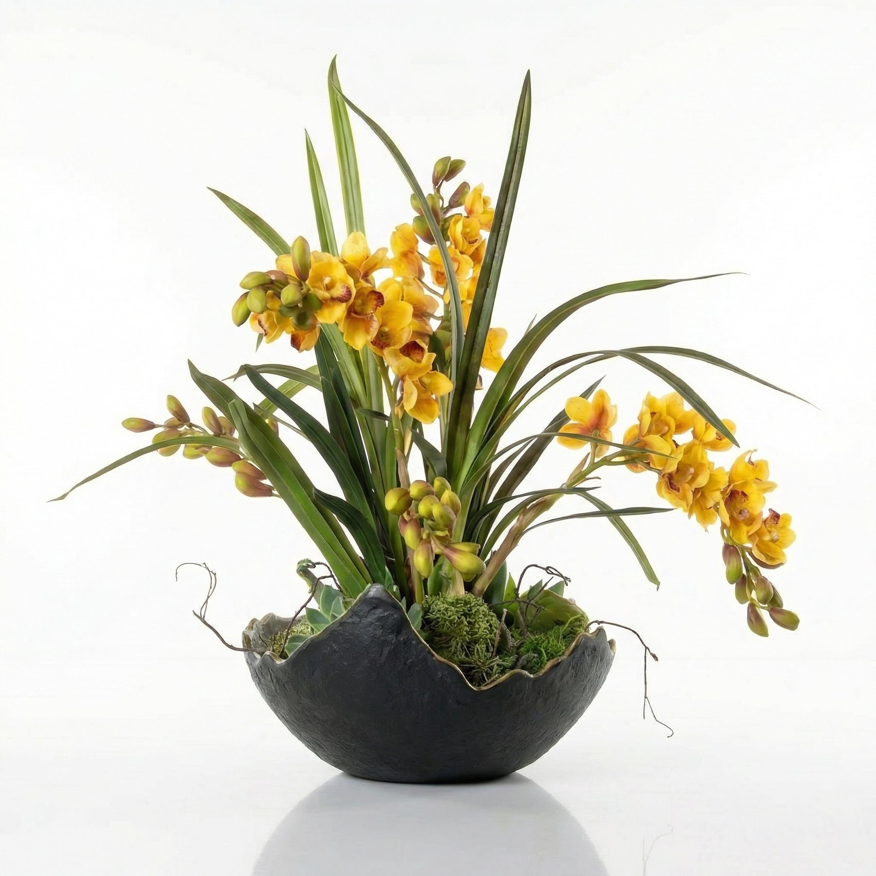 The Golden Horizon Orchid Arrangement is a bold expression of warmth, movement, and sculptural elegance. Vibrant golden orchids bloom gracefully among tall, sweeping green leaves, creating a dynamic silhouette that draws the eye upward. Budding stems and layered greenery add depth and natural texture, while lush succulents at the base ground the design with rich dimension.