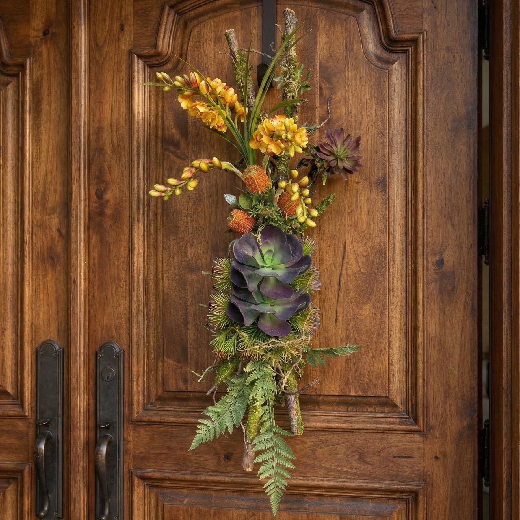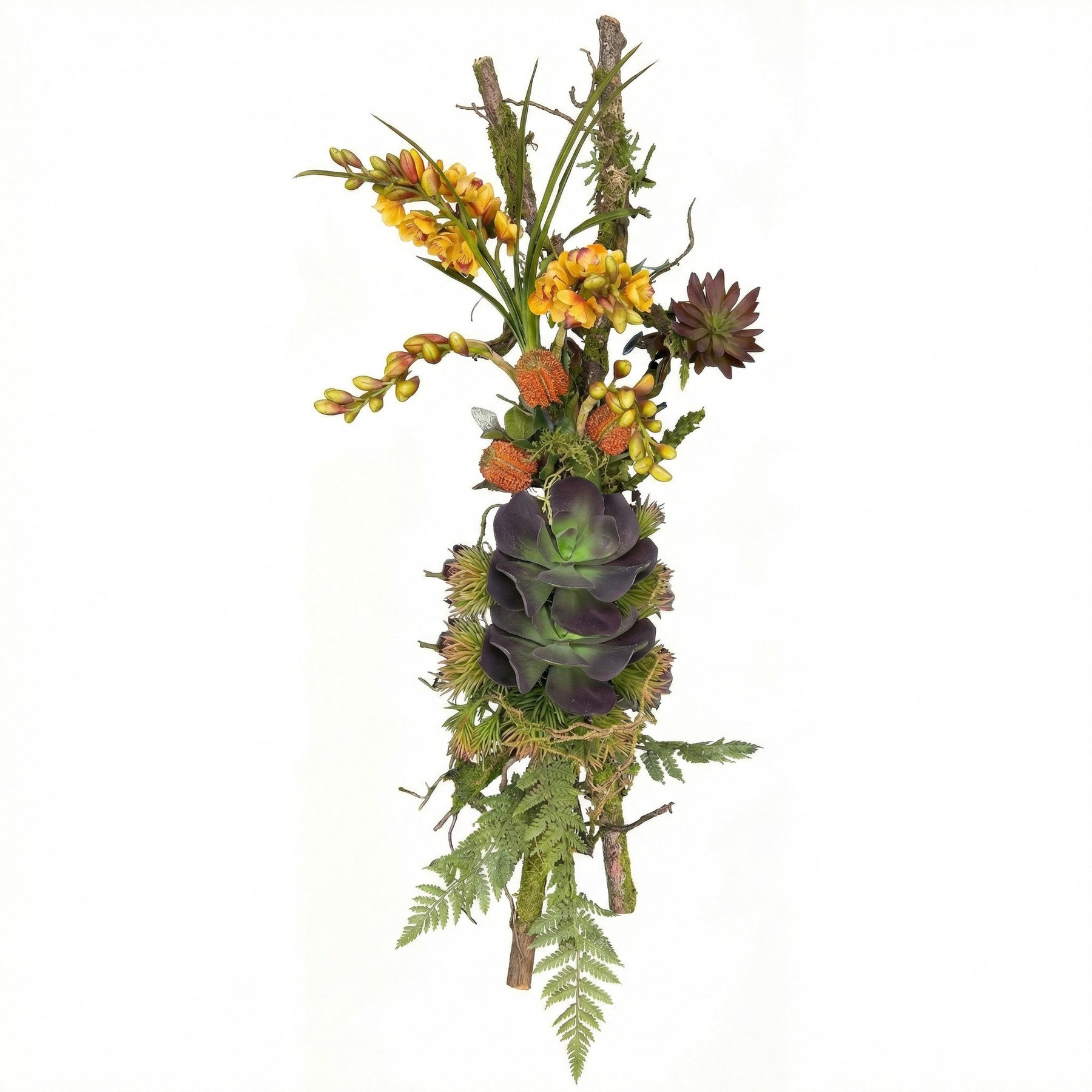 Natural texture meets rustic elegance in the Rustic Succulent and Orchid Wall Arrangement. Designed with a striking vertical composition, this handcrafted piece blends vibrant orchids, sculptural succulents, and organic greenery with natural branches to create a beautifully balanced statement. The arrangement captures the relaxed sophistication of Texas Hill Country style, making it a perfect accent for rustic doors, entryways, patios, or interior wall spaces.