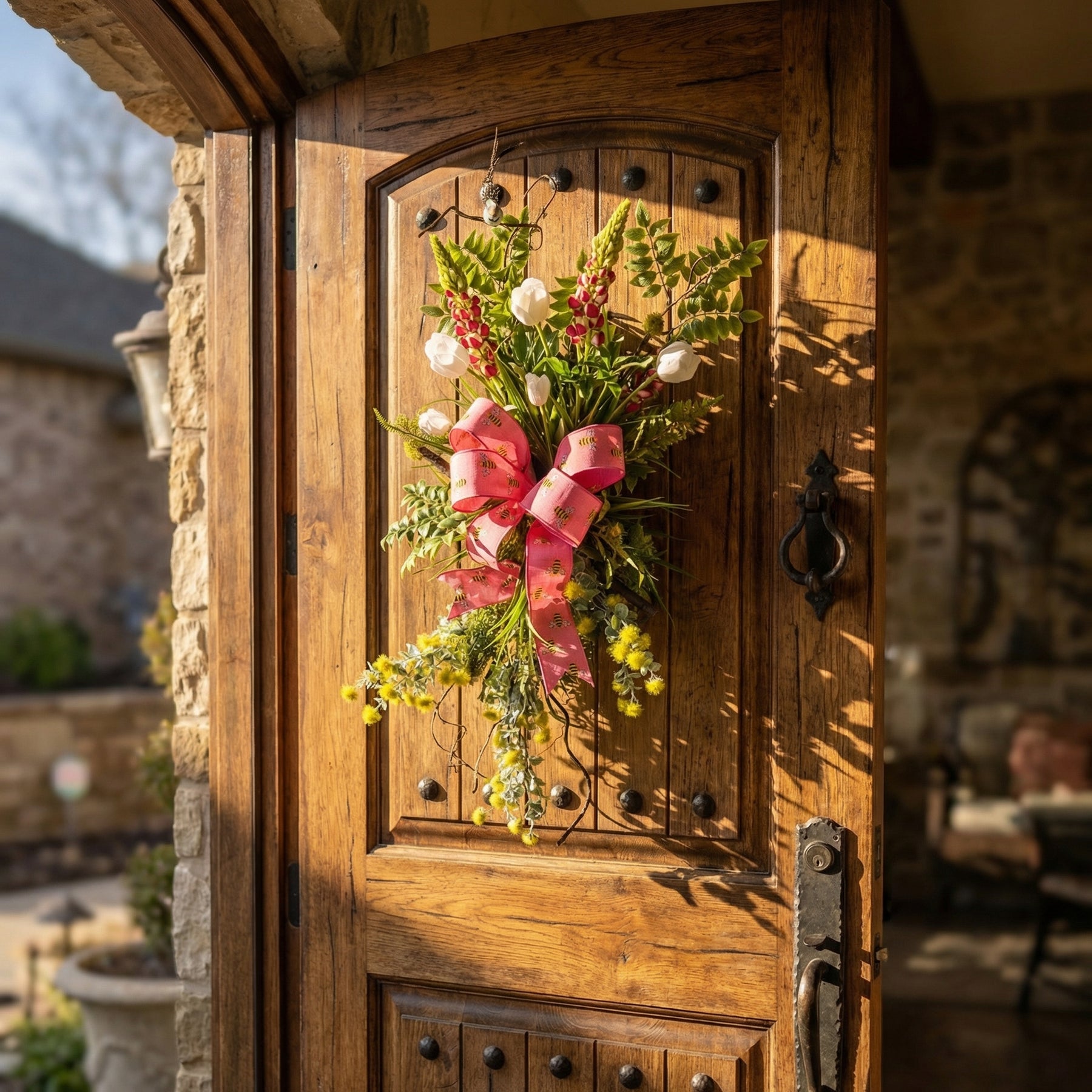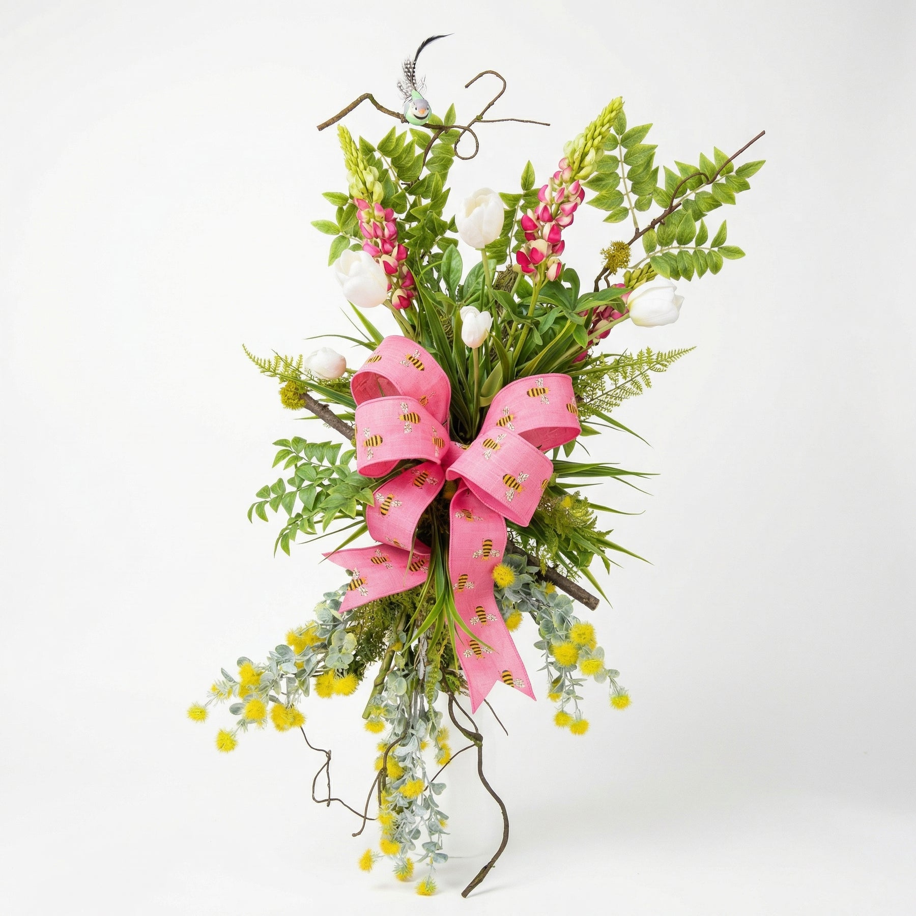 The Peyton Busy Bee Swag is a cheerful celebration of springtime charm and playful elegance. Crisp white tulips rise gracefully among vibrant pink snapdragon stems, creating height and fresh garden movement. A bold pink bow adorned with delicate bee detailing anchors the arrangement, adding a whimsical touch that feels both fun and refined. Cascading silver-green eucalyptus and bright yellow floral accents bring softness and texture, while layered greenery creates a full, dimensional silhouette.