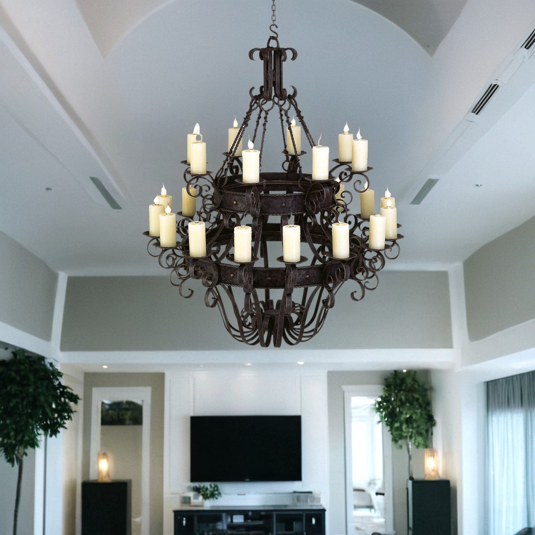 Make a bold and elegant statement with the Maggie Chandelier — a breathtaking two-tier masterpiece of handcrafted ironwork. Featuring 22 candle-style lights arranged across gracefully layered rings, this chandelier showcases intricate scroll detailing and a rich, antiqued finish that exudes Old World charm. Ideal for large foyers, great rooms, or banquet spaces, the Maggie Chandelier brings luxurious scale and timeless sophistication to any interior.