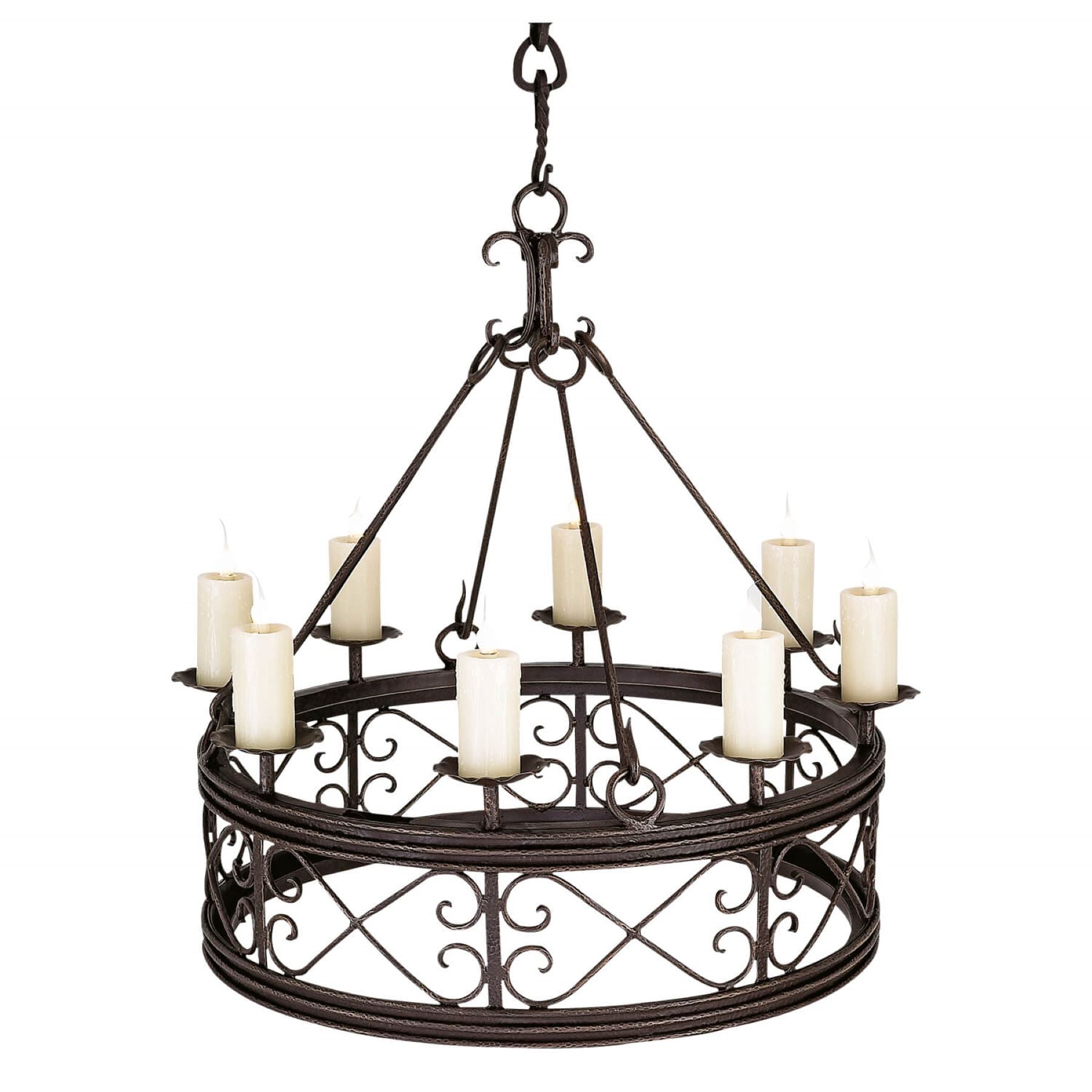 The Beau Chandelier captures old-world elegance with a rugged twist, merging handcrafted ironwork with timeless charm. This round fixture features a forged wrought iron frame adorned with intricate scrollwork and fitted with candle-style light holders that evoke the romance of historic European lighting. Perfect for rustic interiors, wine cellars, or grand entrances, it delivers both ambiance and artistry.
