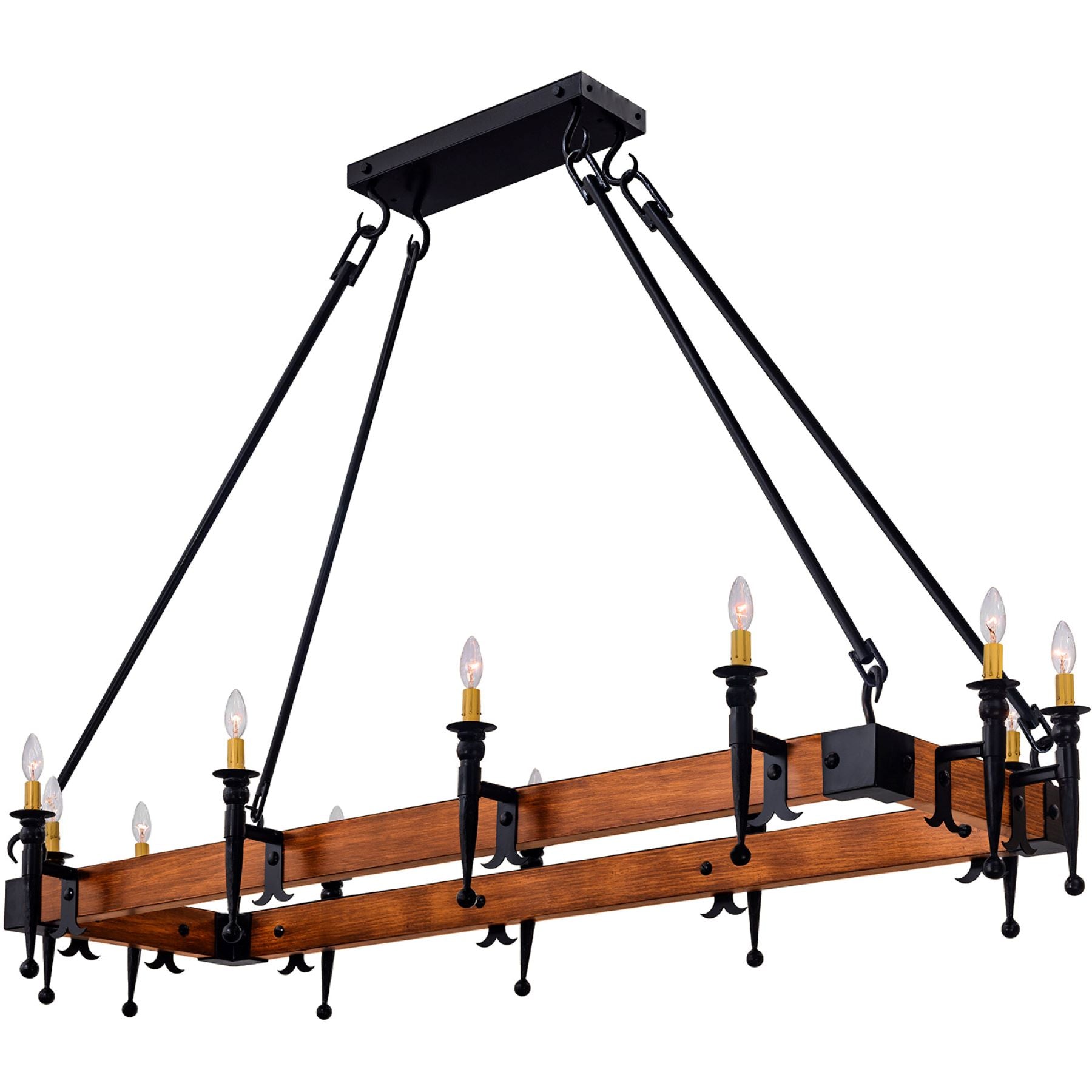 Bold and refined, the Trojan Chandelier is a commanding fixture that fuses traditional craftsmanship with modern strength. Featuring a rectangular frame constructed from rich, warm wood and suspended by sleek blackened steel rods, this chandelier exudes rustic elegance and architectural precision. Twelve iron candle-style lights, perched on forged metal arms, bring ambient illumination with a timeless, medieval-inspired presence.