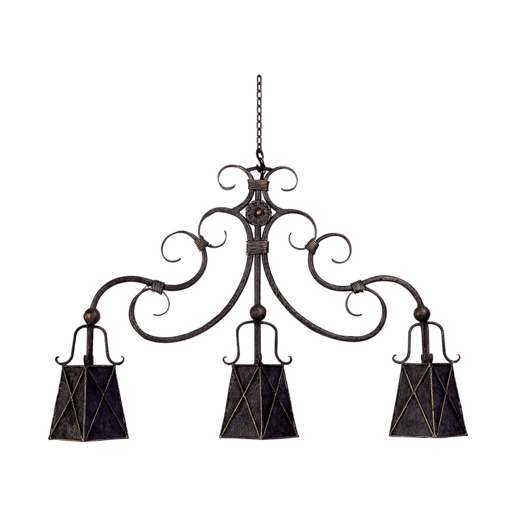 The Lindsey Chandelier embodies timeless sophistication with a touch of rustic grandeur. Hand-forged ironwork flows in graceful scrolls, anchoring three lantern-style shades suspended from ornate hooks. The blackened iron finish is subtly distressed, adding depth and old-world charm to any space.