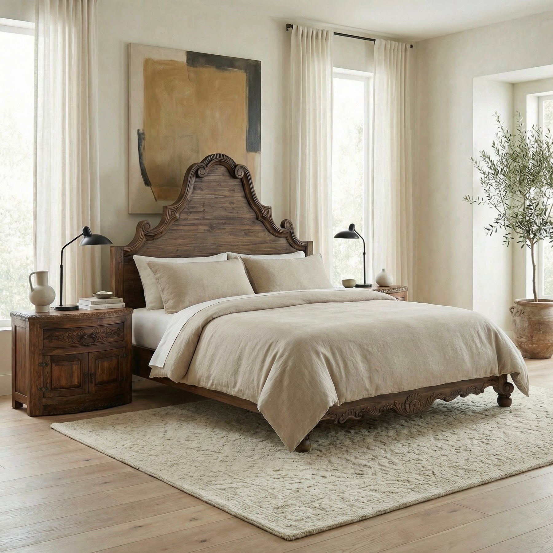 The Cadillac No Poster King Bed from the Jason Scott Collection is a true statement piece, blending timeless craftsmanship with bold design. Hand-carved from solid reclaimed teak, this bed showcases intricate detailing across the headboard, footboard, and frame, reflecting the artistry and character of old-world woodworking. Its grand silhouette, accented with sweeping curves and refined carvings, brings a sense of luxury and presence to any bedroom.