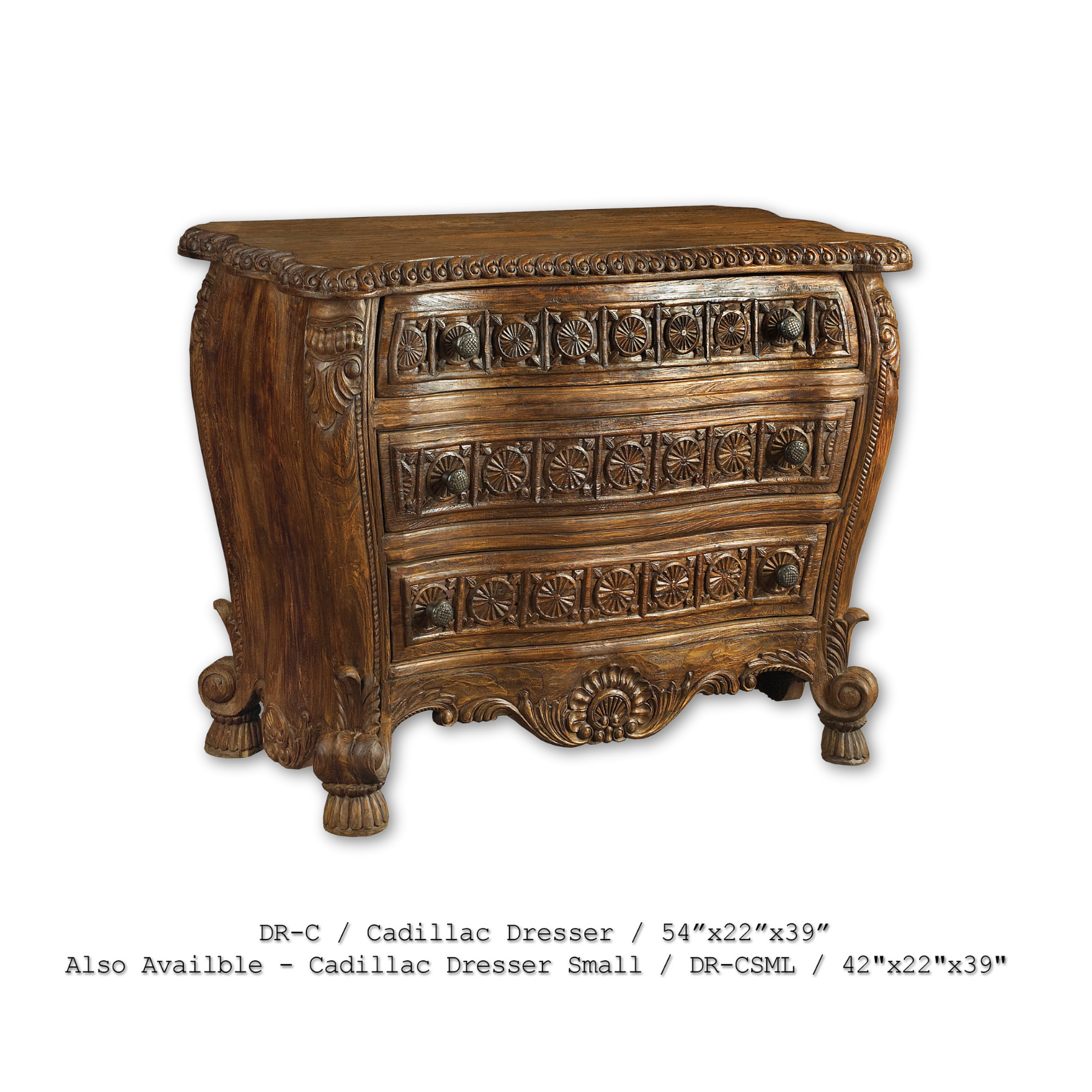 The Cadillac Dresser is a luxurious statement piece that showcases exquisite craftsmanship and bold design. Featuring a gracefully bowed front, this dresser is adorned with hand-carved floral rosettes, rope-edge detailing, and an ornate base apron with scrollwork. Each of the three spacious drawers offers both storage and timeless elegance, all wrapped in a rich, hand-finished wood tone.