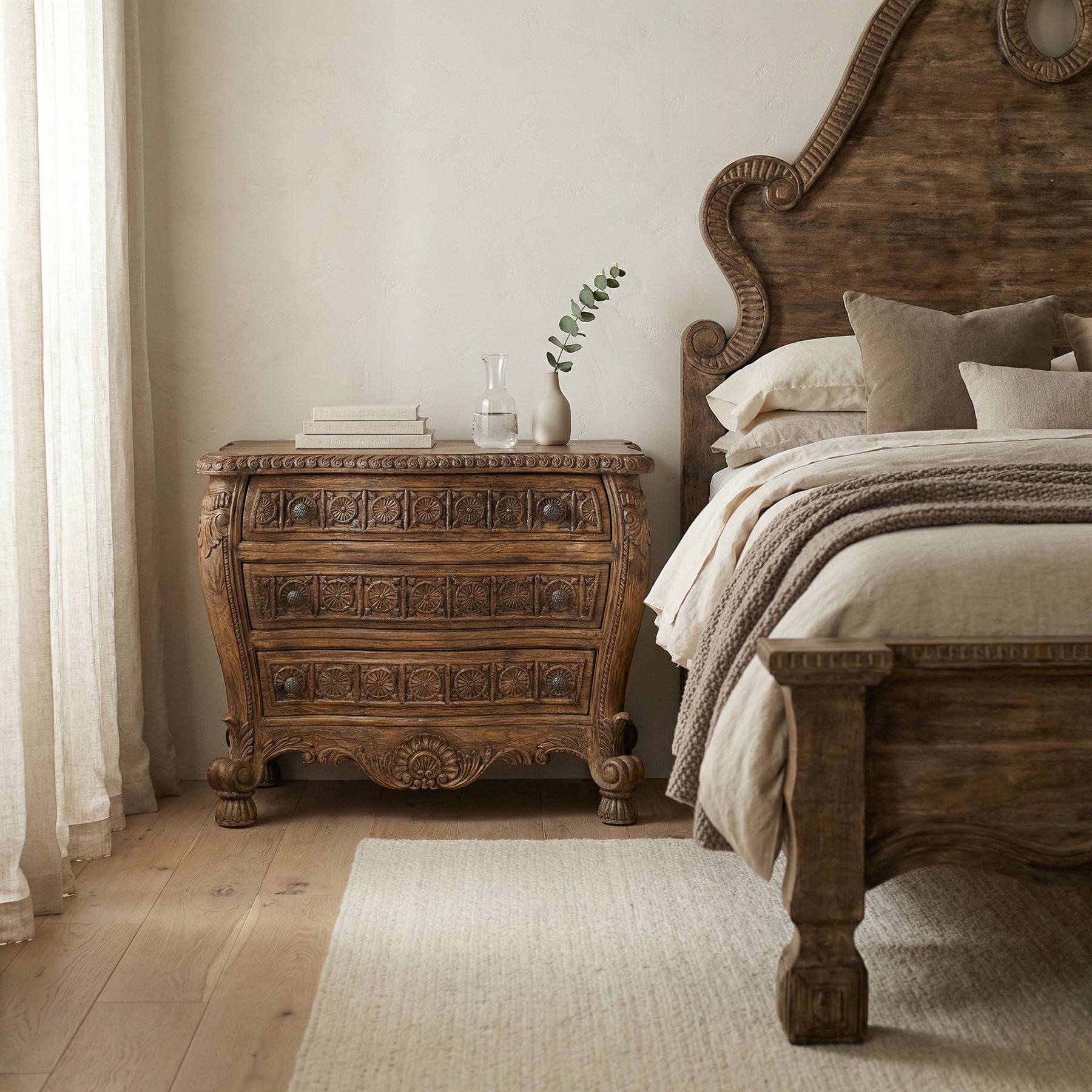 Intricately hand-carved drawer fronts with floral medallions