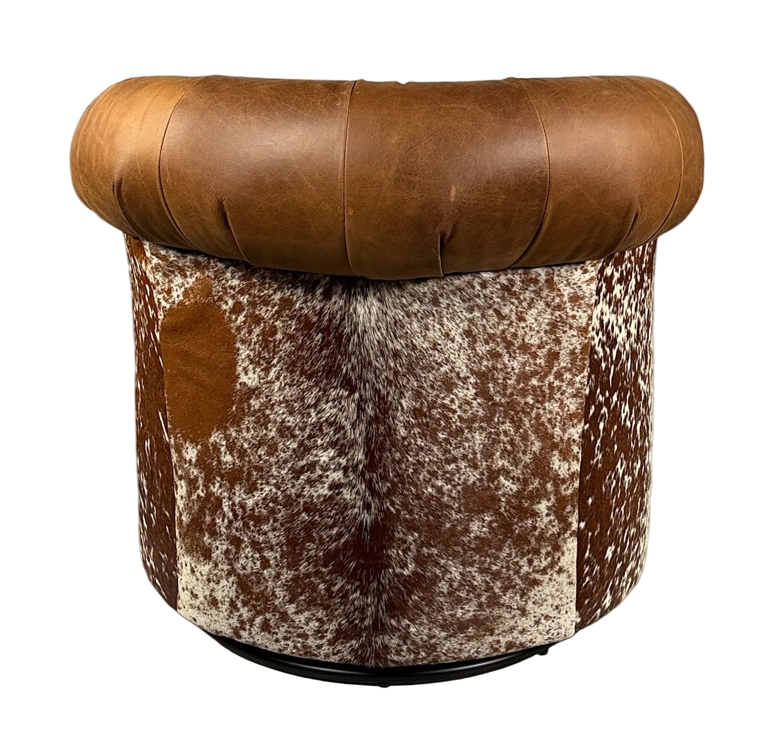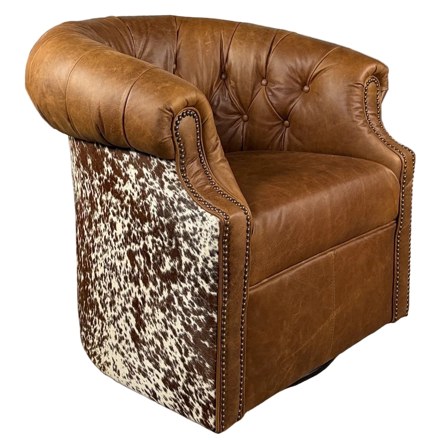 Elevate your living space with the bold Western elegance of our Coyote Hair-On-Hide Longhorn Swivel Chair. Wrapped in rich full-grain leather and accented with genuine hair-on-hide panels, this chair delivers a perfect balance of rugged character and refined comfort. The tufted barrel-back design offers a supportive, enveloping sit, while the smooth swivel base adds modern functionality for everyday living.