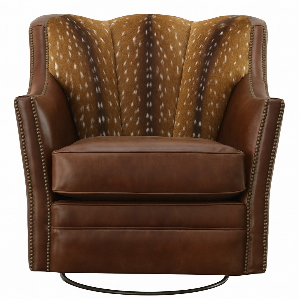 Make a bold impression with the Panther Swivel Chair — a luxurious blend of rustic elegance and standout design. Featuring supple top-grain leather and a stunning axis deer hide channel-tufted backrest, this chair offers both wild style and refined comfort. The smooth 360-degree swivel allows for easy movement, while antique nailhead trim and a structured silhouette add tailored sophistication. It's the perfect focal point for Western lodges, upscale studies, or rustic-modern living rooms.