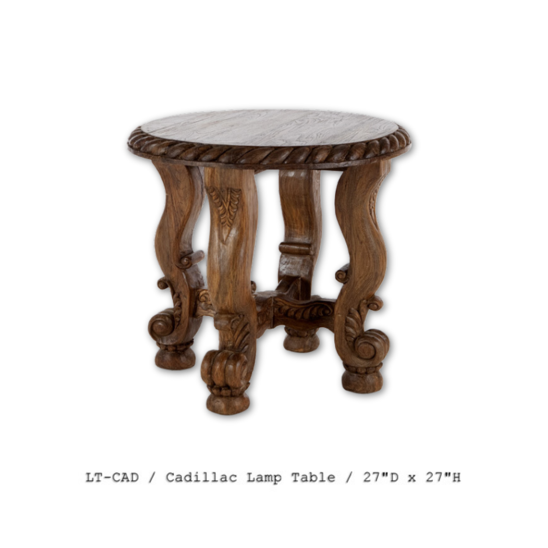 The Cadillac Lamp Table is a true testament to timeless design and exquisite craftsmanship. Featuring a round, solid wood top with a carved rope edge, this table rests on elegantly curved legs adorned with intricate scrollwork and classic claw feet. The ornate stretcher detail beneath adds both structural support and artistic flair, creating a piece that is as functional as it is beautiful.