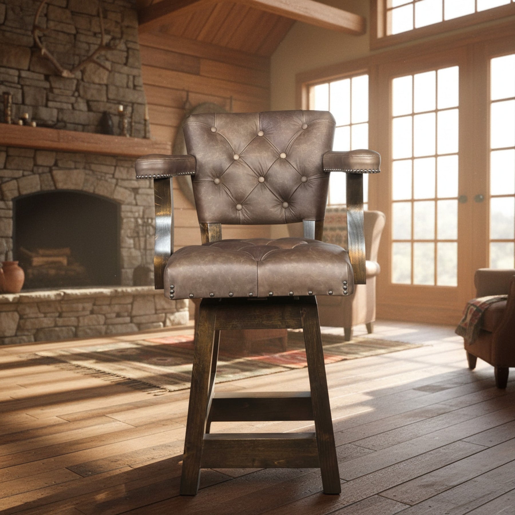 Rustic elegance meets rugged charm in the Denali Ranch Tufted Ranger Stool, a standout addition to any bar or kitchen island. This handcrafted stool features a richly padded seat and backrest upholstered in premium distressed leather with deep diamond tufting for timeless sophistication. The armrests are accented with nailhead trim, and the back is finished with genuine cowhide for a bold Western flair.