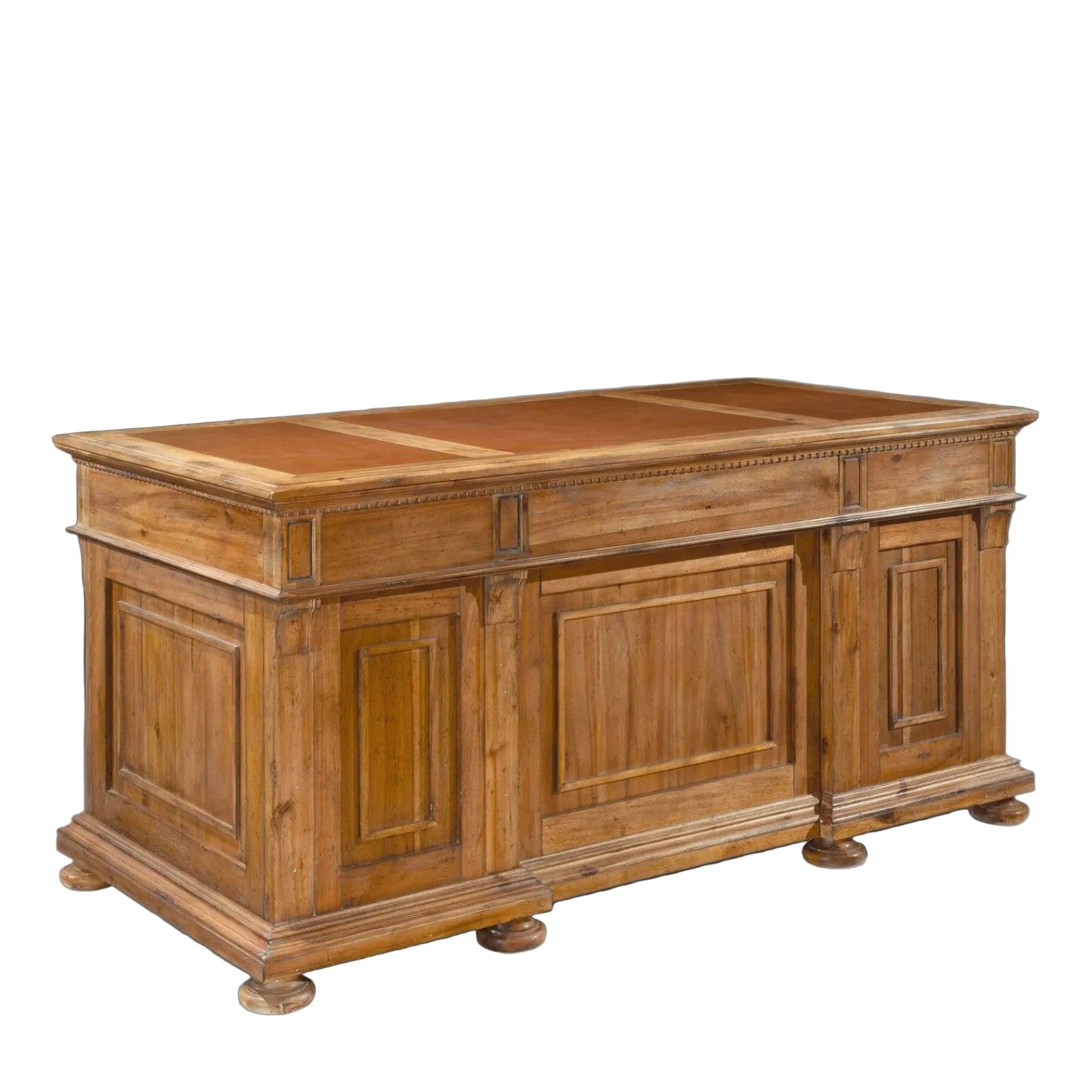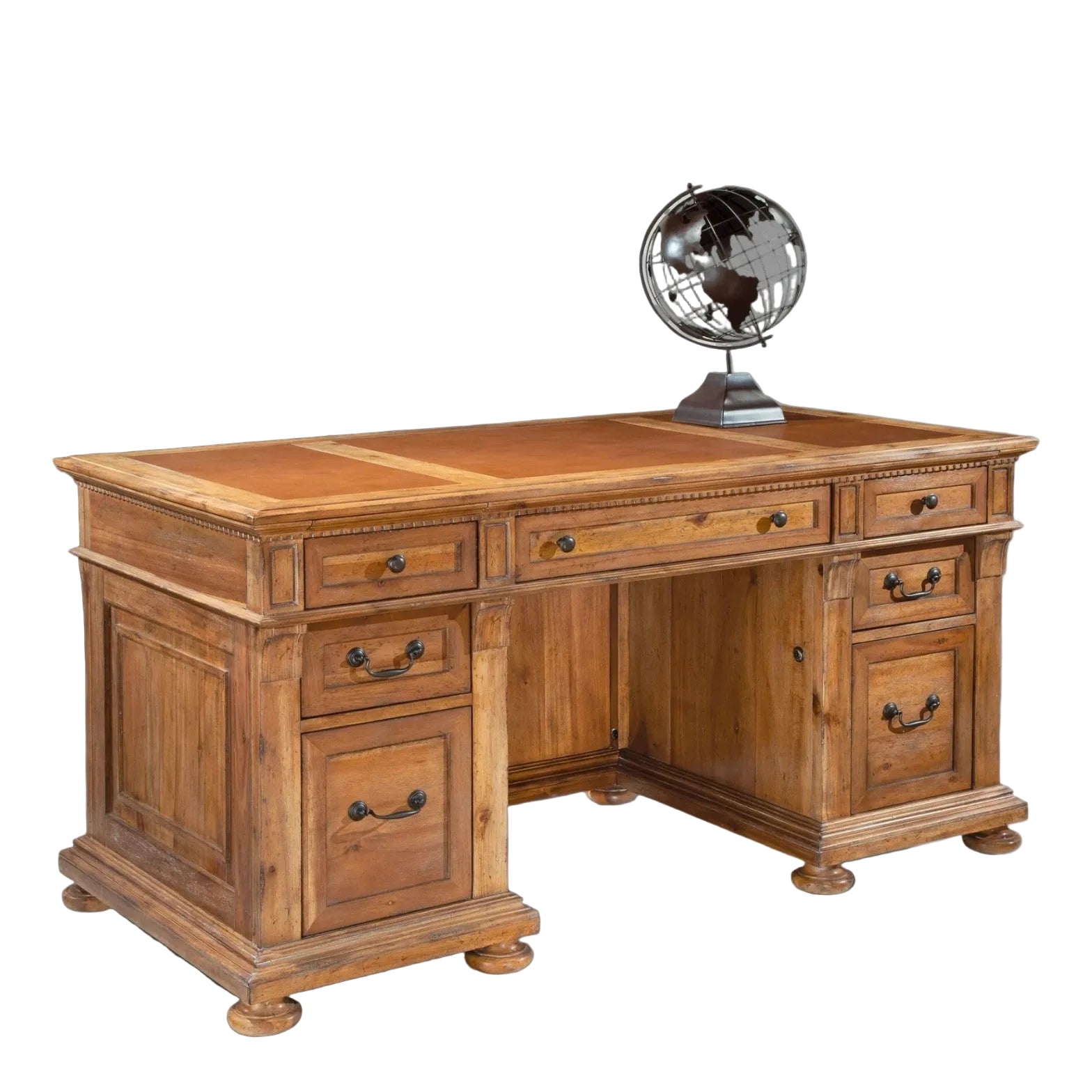 The Junior Executive Desk brings stately sophistication to smaller office spaces without sacrificing craftsmanship or functionality. Made from solid wood with a warm, natural finish, this desk features a classic panel design, bun feet, and a leather-inset top for a refined executive look. With seven drawers including file storage and a center pencil drawer, it offers practical organization wrapped in timeless style.